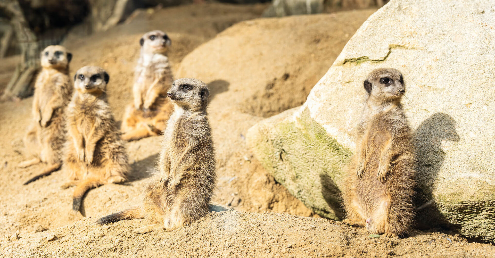 Afrika, genauer die -Kalahari-Wüste, die sich über Teile von Botswana, Namibia und Südafrika erstreckt, ist ein natürlicher Lebensraum der Erdmännchen. Diese kleinen geselligen Tiere mit ihrem putzigen Aussehen und ihrem kooperativen Verhalten haben die Herzen von Menschen in aller Welt gewonnen, und Erdmännchenkolonien sind auch im Zoo immer ein großer Besuchermagnet. Wir haben uns im Linzer Zoo am Pöstlingberg, dem Hausberg der Linzer, mit der Zoologischen Leiterin Sabina Moser getroffen, um den hier lebenden Erdmännchen gemeinsam einen Besuch abzustatten. Ein einmaliges Erlebnis, das einem für immer in Erinnerung bleiben wird. Die kleinen Säugetiere mit einem ungefähr 25 bis 35 cm langen Körper und einem etwa ebenso langen Schwanz sind flink und robust. In der freien Wildbahn wissen sich diese süß und knuddelig aussehenden Wesen durchaus gegen Gefahren zur Wehr zu setzen. Das zeigt sich etwa im Umgang mit Skorpionen: Erdmännchen greifen Skorpione an, bevor diese sie angreifen können, beißen ihnen den Stachel ab und reiben ihn dann im Sand, um das Gift daraus zu entfernen. Und danach fressen sie die Skorpione! Zum Glück hat diese Information erst nach dem Erstkontakt mit den kleinen Raubtieren zu uns gefunden und so stand einer entspannten hautnahen Begegnung nichts mehr im Weg.