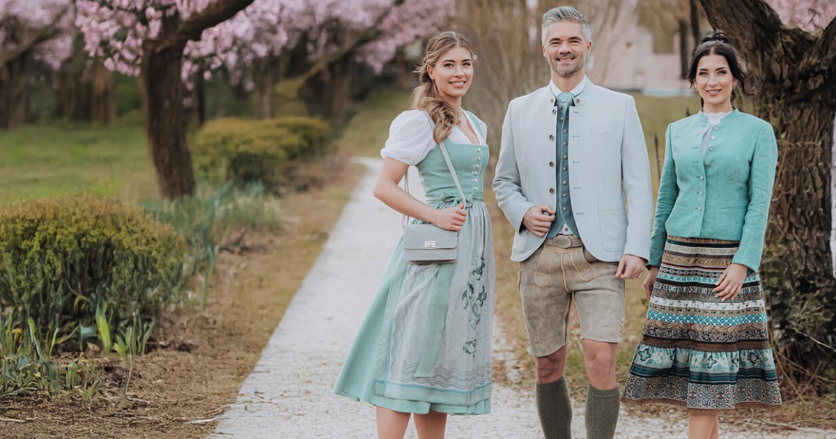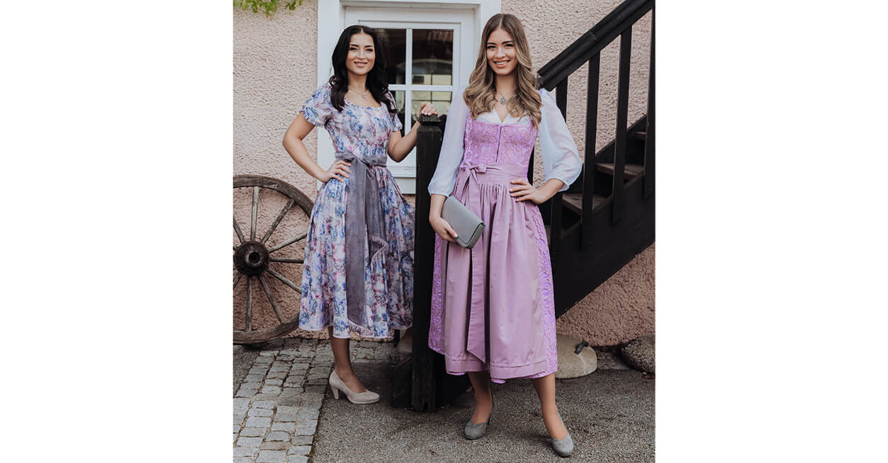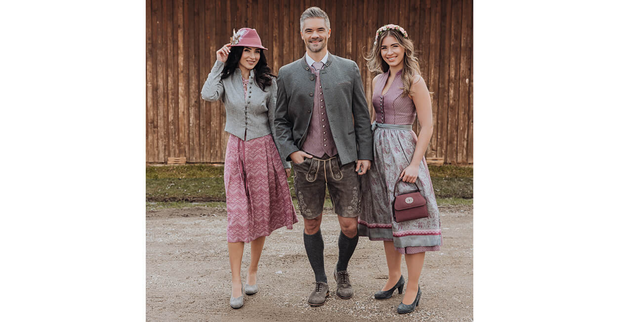 schnitt, während das pastellige Dirndl mit Hakenverschluss durch den dreidimensionalen Blüten-Jacquard und die raffinierte Webtechnik besondere Feinheit versprüht. Gesehen bei Trachten Wichtlstube.