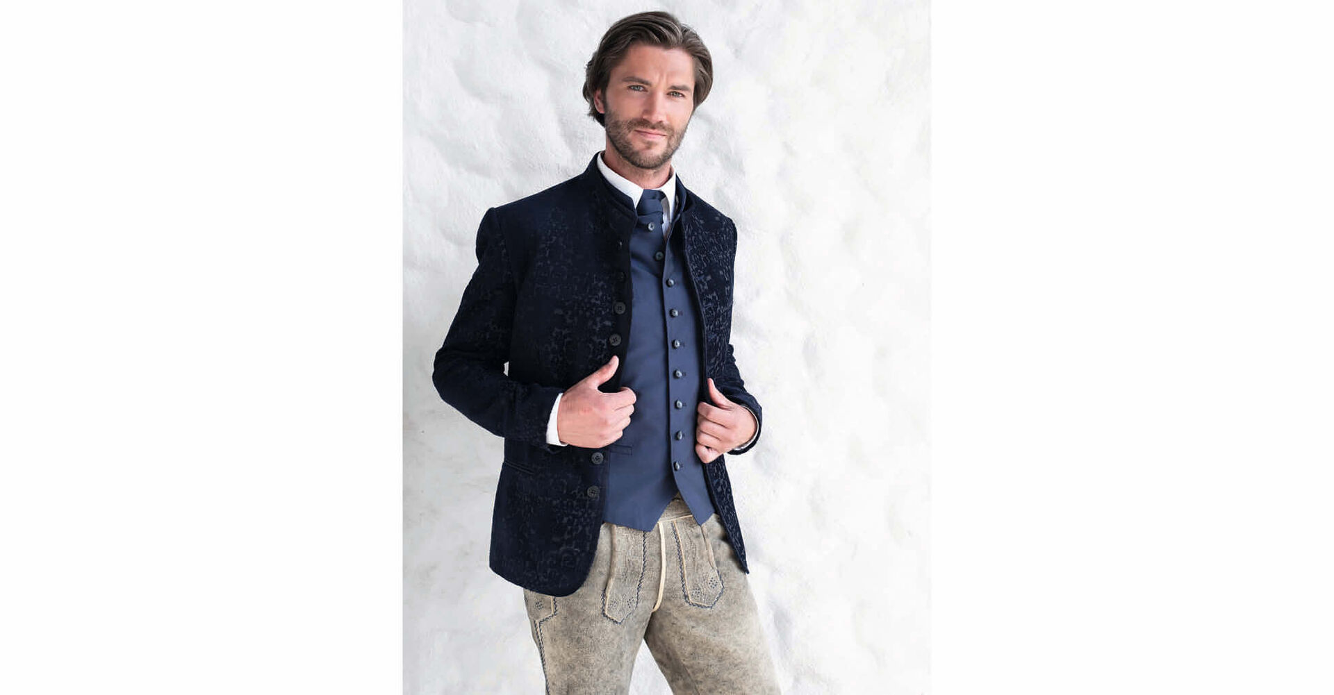 Von Hochzeit bis Business. Harmonisch auf die Damen abgestimmt, trägt Gregor eine handgestickte Hirschlederhose mit Samt-Gilet und elegantem Sakko.