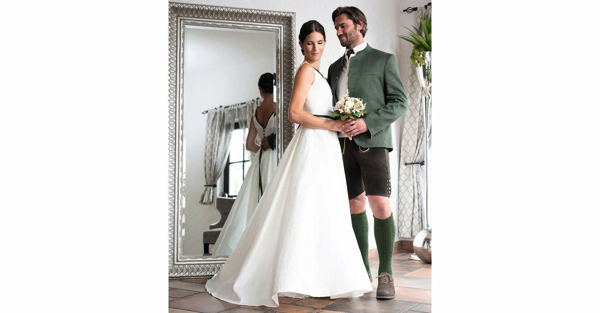 Vom JaWort zum Lieblingsstück. Exklusive Stoffe aus der hauseigenen Schneiderei verbinden Margheritas Dirndl und Gregors Gilet zu einem stimmigen Ensemble mit zauberhaften Details.