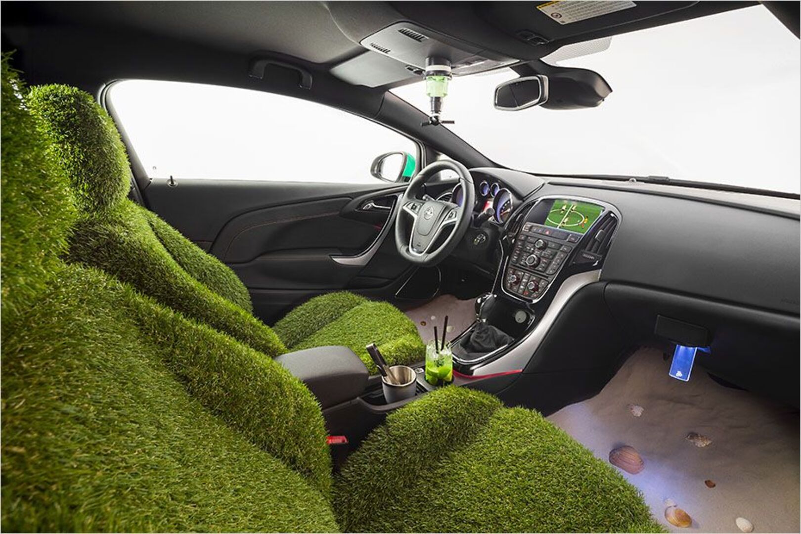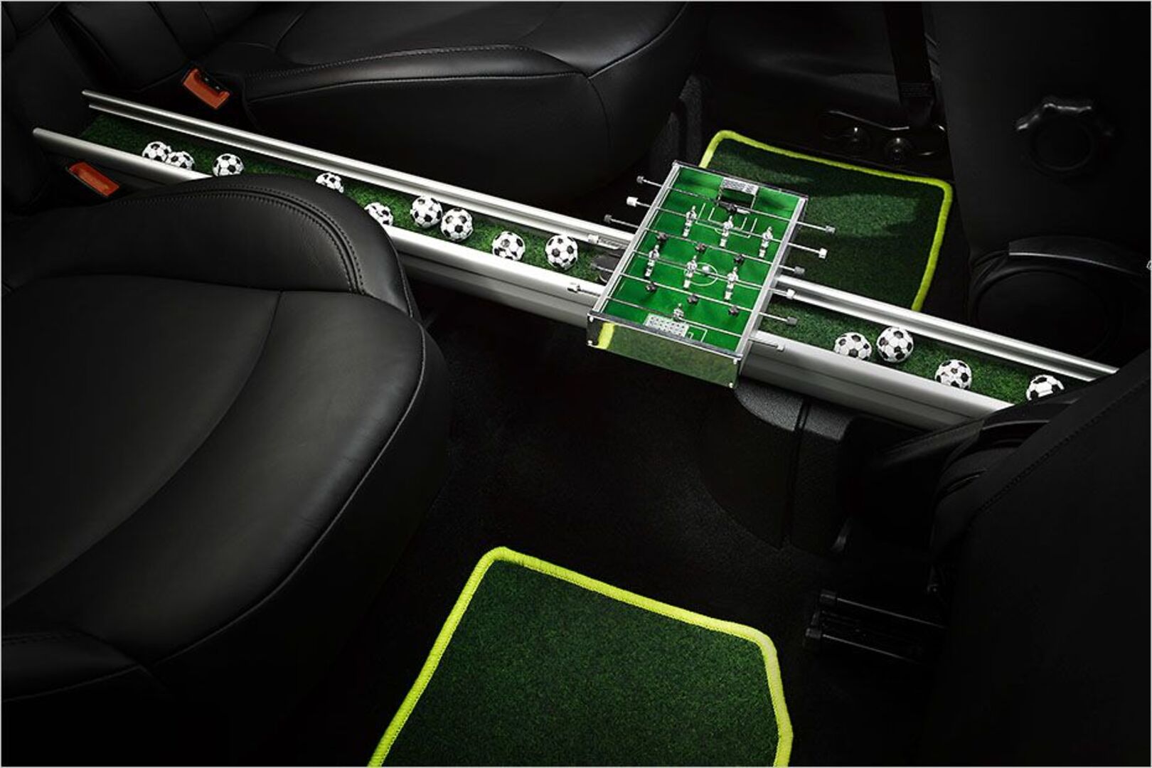 Ach ja, und für Langeweile im Stau gibts innen noch einen Mini-Kicker. Die coole Idee wird mit Fußmatten in Kunstrasen-Ausführung und weiteren Gimmicks…