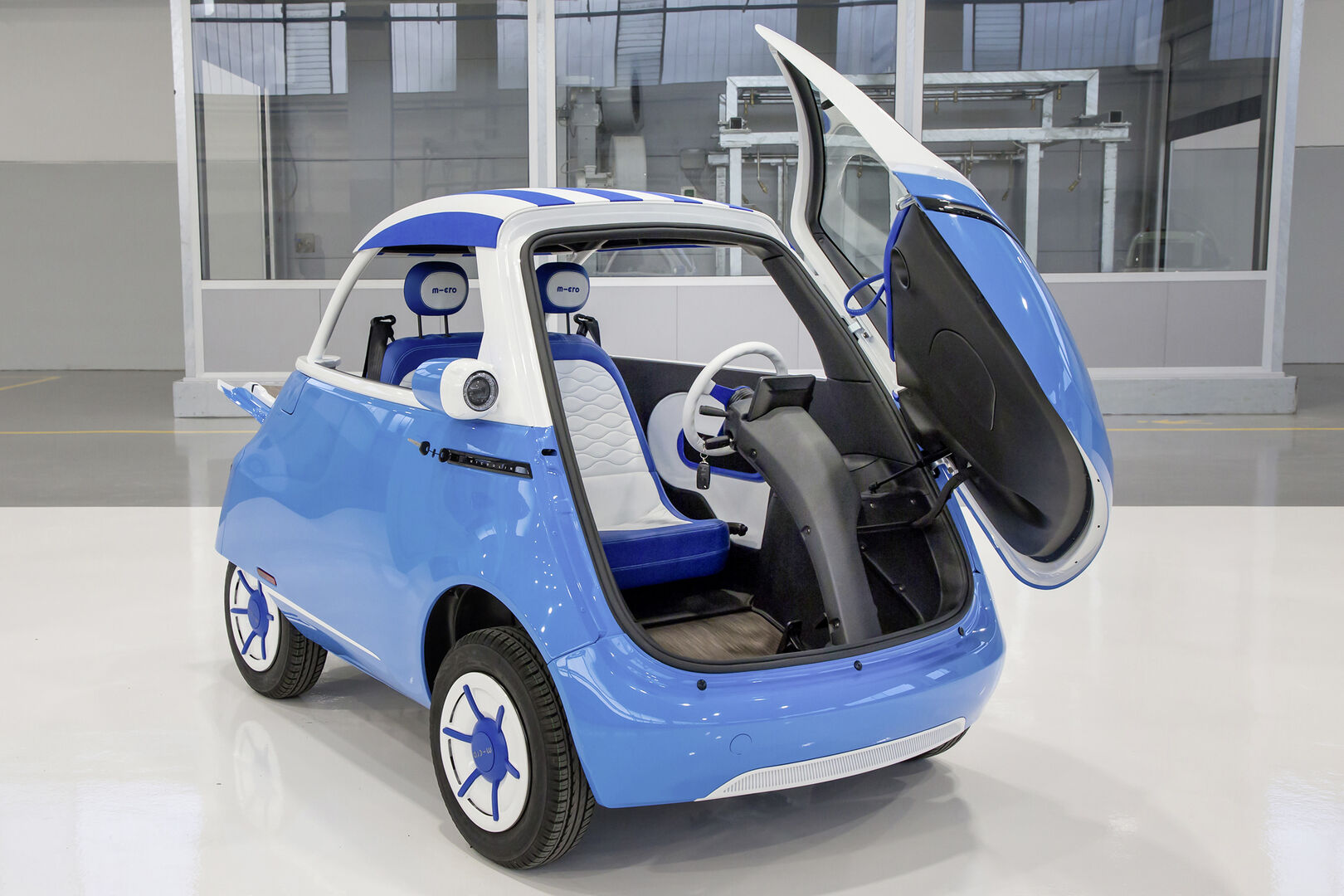 Wenn der knuffige Kleine die Klappe öffnet, durch die man einsteigt, sieht es so aus, als würde er zur Vorstellung den Hut heben. Angelehnt an den BMW Isetta (oben) aus den 1950ern, bietet er Platz für "zwei Erwachsene und drei Bierkisten" wie es der Schweizer Hersteller formuliert. Das Elektrofahrzeug hat auch eine kleine Schwester – das Trike "Microletta".
