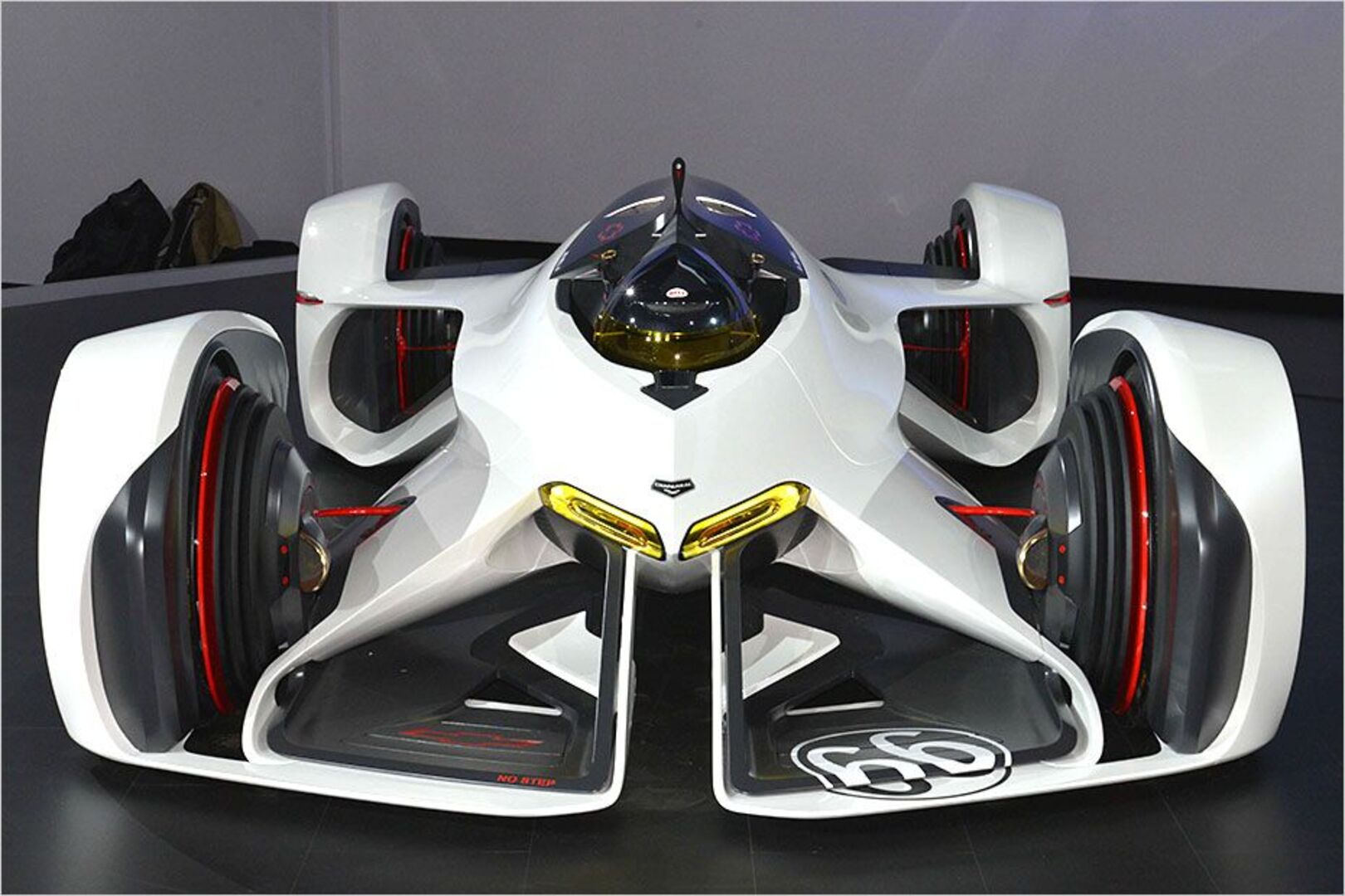 In dem extrem flachen Rennwagen liegt der Fahrer mit dem Gesicht nach unten, Arme und Beine zeigen in Richtung der Räder