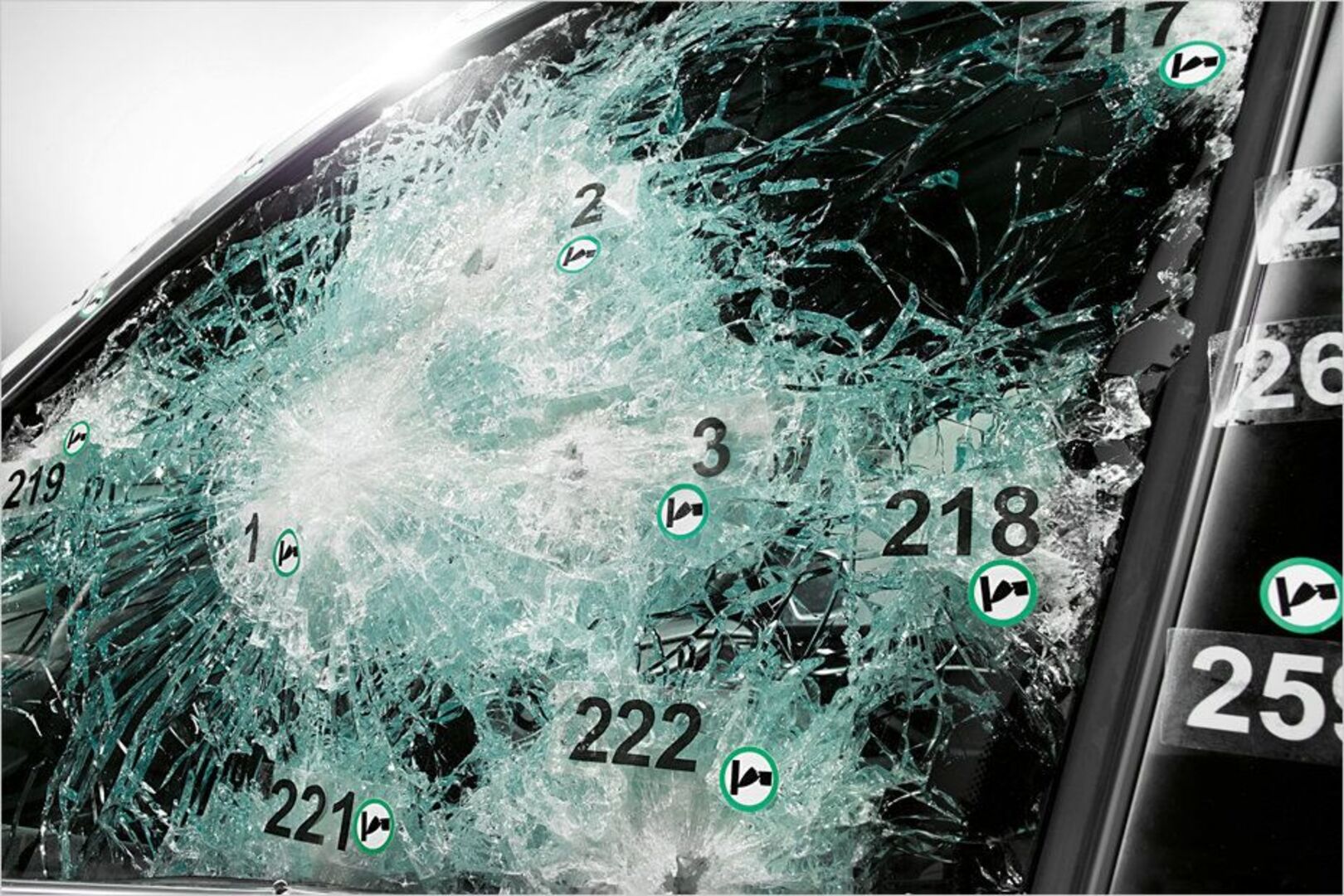 Das Sicherheitsglas verfügt über eine spezielle Schicht, die einen Splitter-Regen auf die Insassen verhindern soll