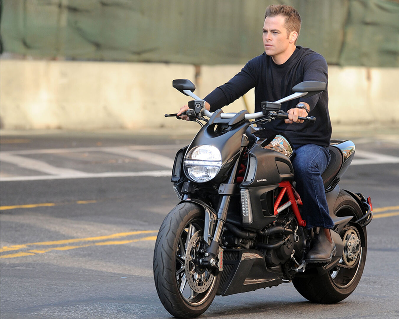 Chris Pine bei Dreharbeiten auf einer Ducati