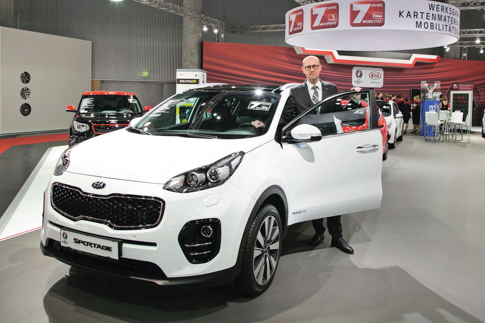 Gilbert Haake (Public Relations, Kia Austria) vor der vierten Generation des Kia Sportage. Zu sehen war auch die neue Limousine Kia Optima in geschärftem…