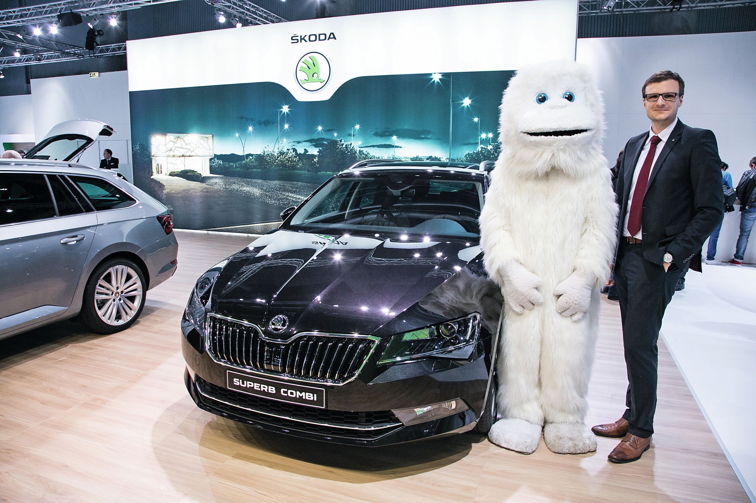 Das Flaggschiff der Skoda-Modell-Palette: Der Skoda Superb Combi mit „Yeti“ und Sebastian Scheibl, Markenkommunikation Skoda, Porsche Holding.