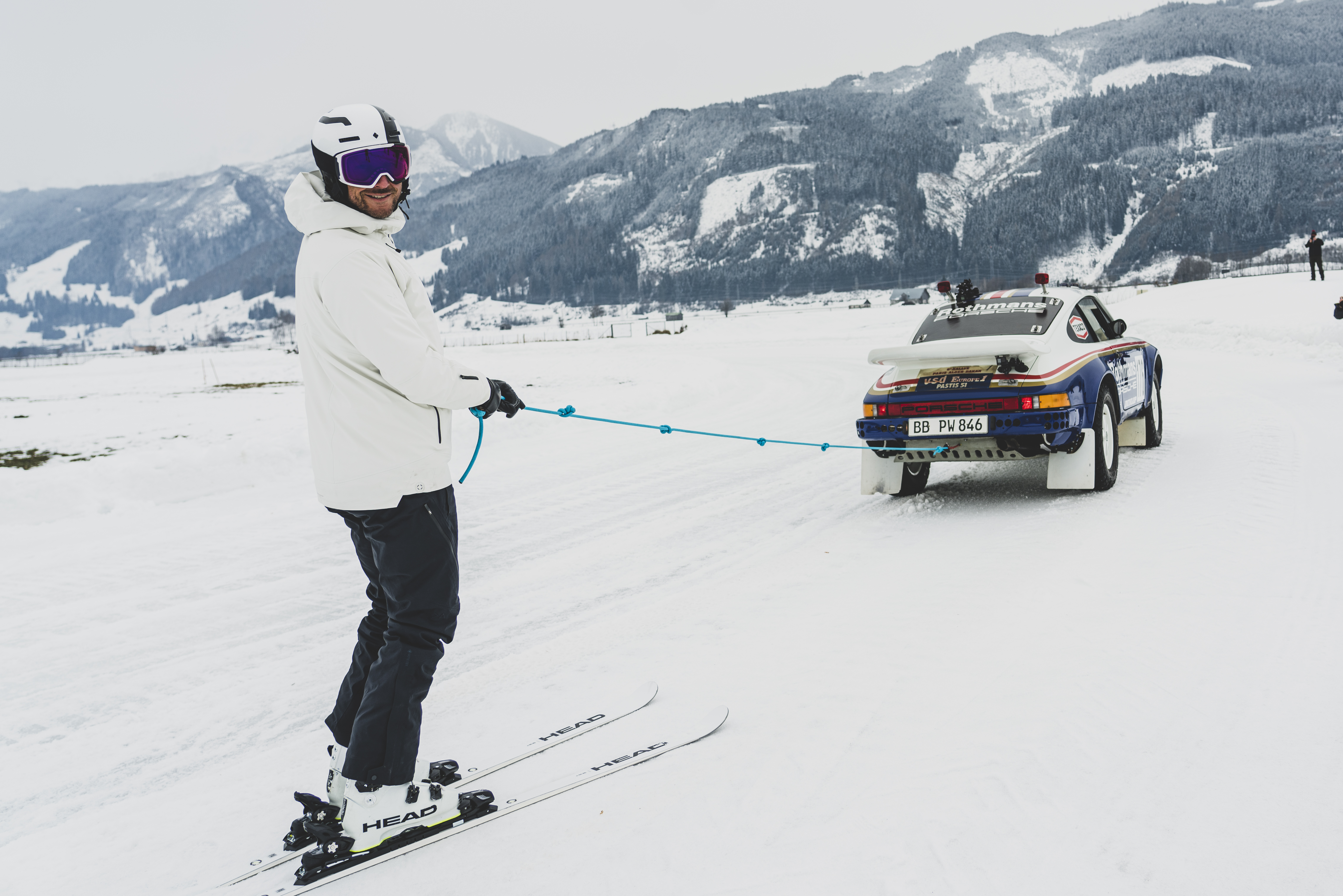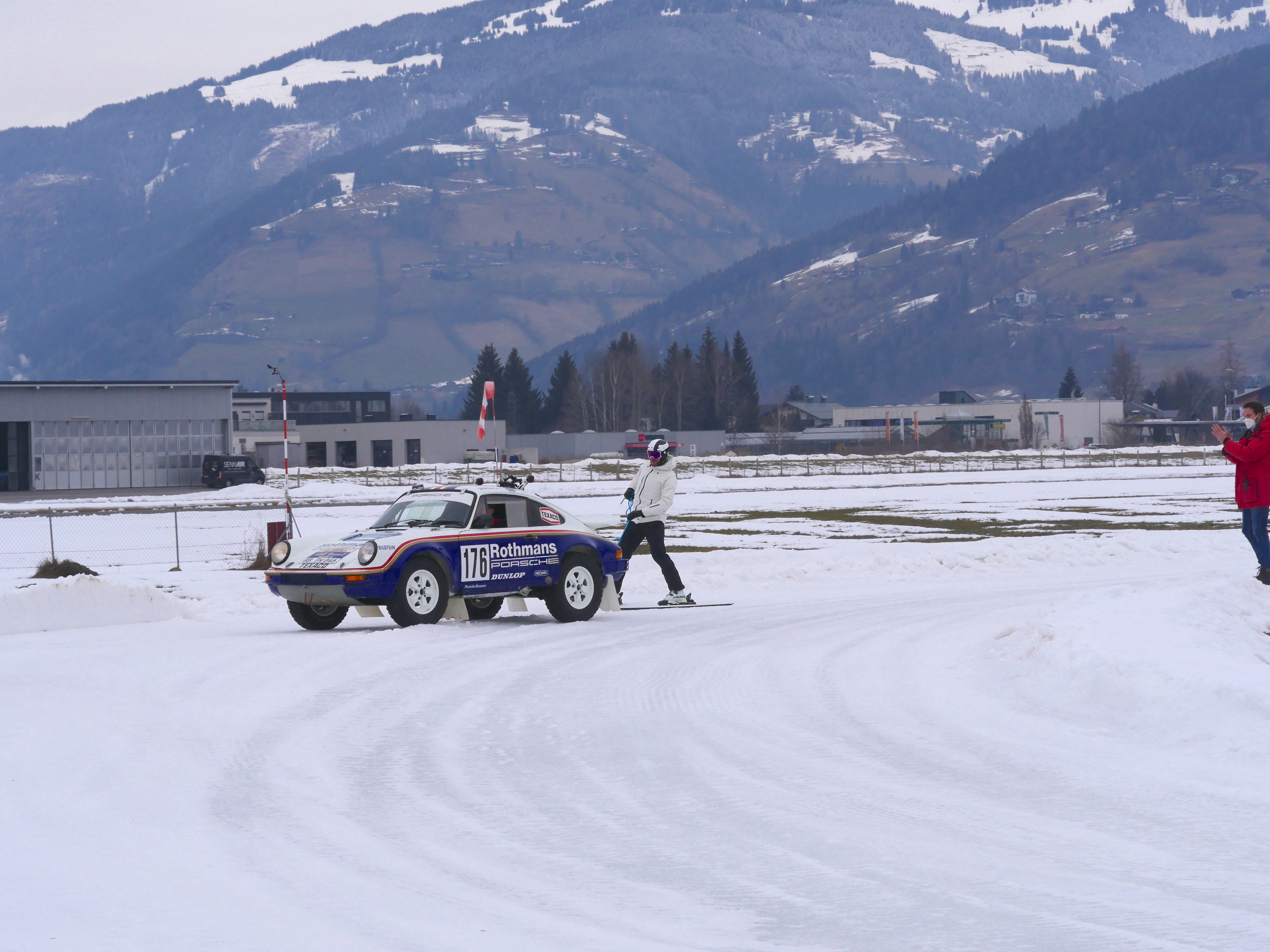 Das große Vorbild: Ein Porsche 911 (953), der bei der Rallye Paris-Dakar 1984 im Einsatz war. Im Bild wird Ex-Skistar Aksel Lund Svindal vom Dakar-Porsche übers Eis gezogen (Zell am See).