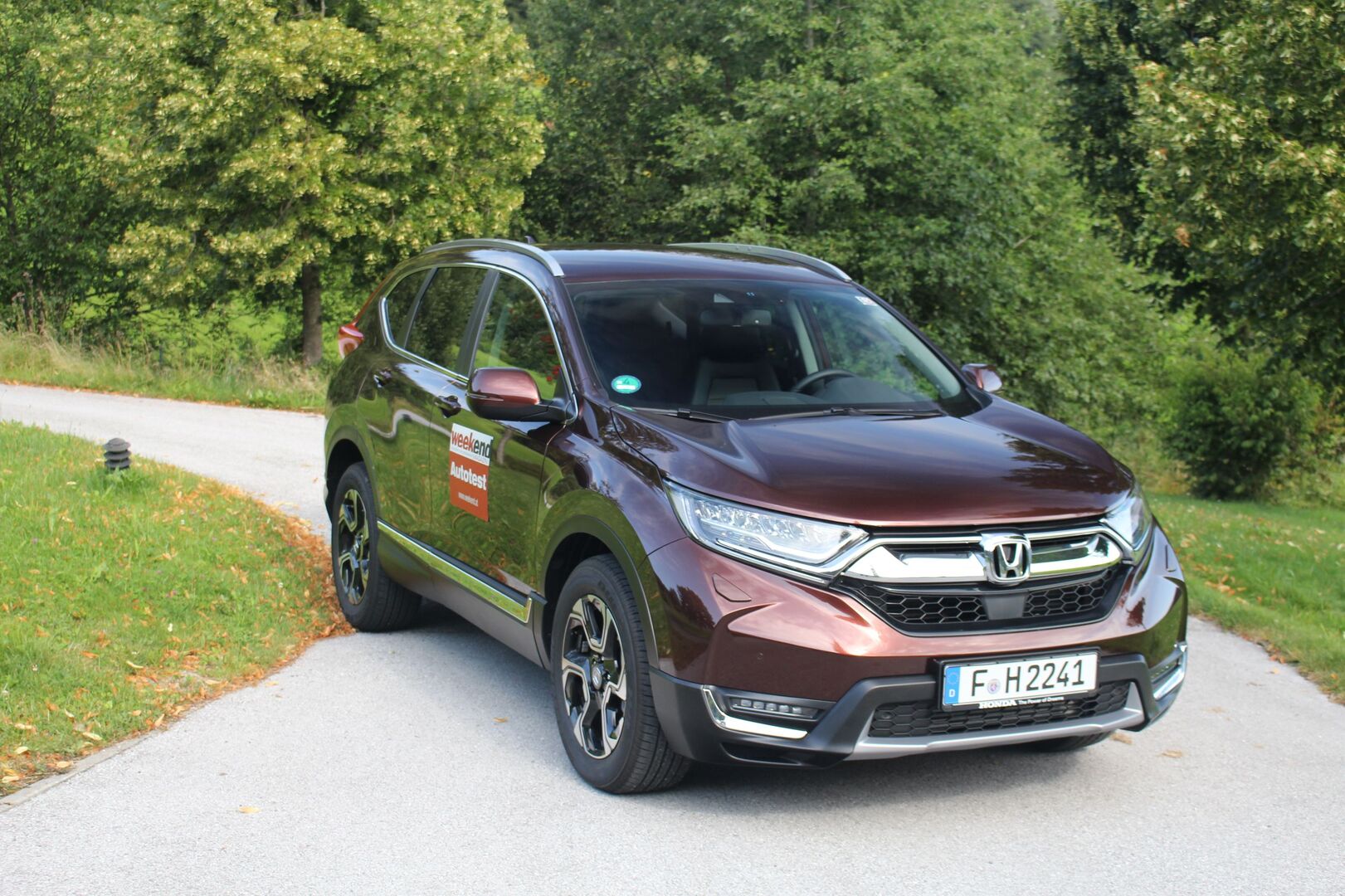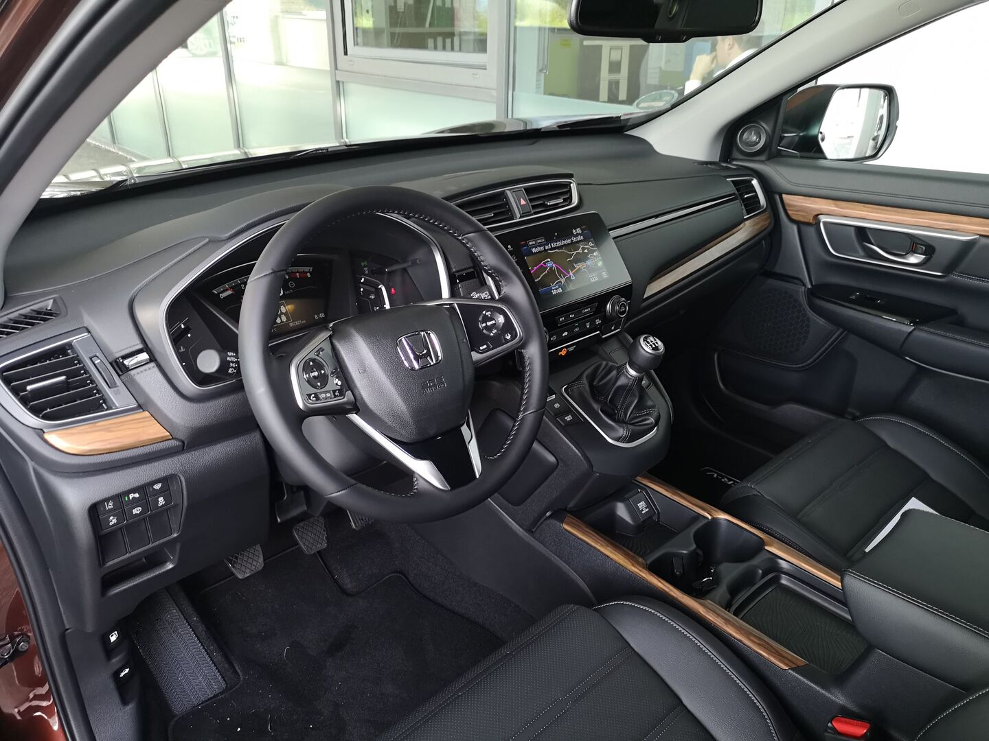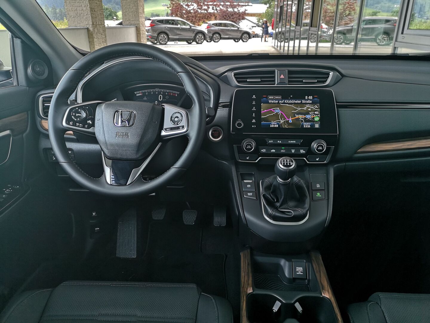 Auf knapp 4,6 Meter Gesamtlänge schafft Honda ein mehr als ordentliches Raumangebot. Der CR-V ist als Fünf- oder Siebensitzer zu bestellen und bietet einen stark variablen Innenraum, der viel Platz für alle Insassen ermöglicht. Das Cockpit ist klar und aufgeräumt, erinnert aber stark an den Civic. Die dreigeteilte Tachoeinheit, das Infotainment in der Mitte und die Schalteinheit sind sehr ähnlich. Die Materialien sind hochwertig, vor allem in der Executive Top-Ausstattung. Ein Head-Up-Display zeigt alle wichtigen Infos im Blickfeld des Fahrers an. Rückfahrkamera und Parksensoren machen einen soliden Job. Einzig das Infotainmentsystem wirkt leider etwas altbacken, lässt sich aber mit Apple CarPlay und Android Auto sozusagen pimpen. Ein Lobeslied auf die Honda-Ingenieure singen wir, weil es einen Drehknopf für die Lautstärke gibt – dies erspart viel getouche (am Touchscreen) und getippe (am Lenkrad). In Zeiten der „Digitale Natives“ wurde auch an die Kinder gedacht. USB-Anschlüsse gibt es jetzt auch hinten und auf Wunsch eine Sitzheizung für den Nachwuchs auf den Rücksitzen. Für Sicherheit sorgt das serienmäßige Sicherheitspaket namens Honda-Sensing. Dieses vereint die wichtigsten Assistenten und sorgt dafür, dass der Fahrer auf Wunsch perfekt unterstützt wird. Weitere Assistenten sind optional.