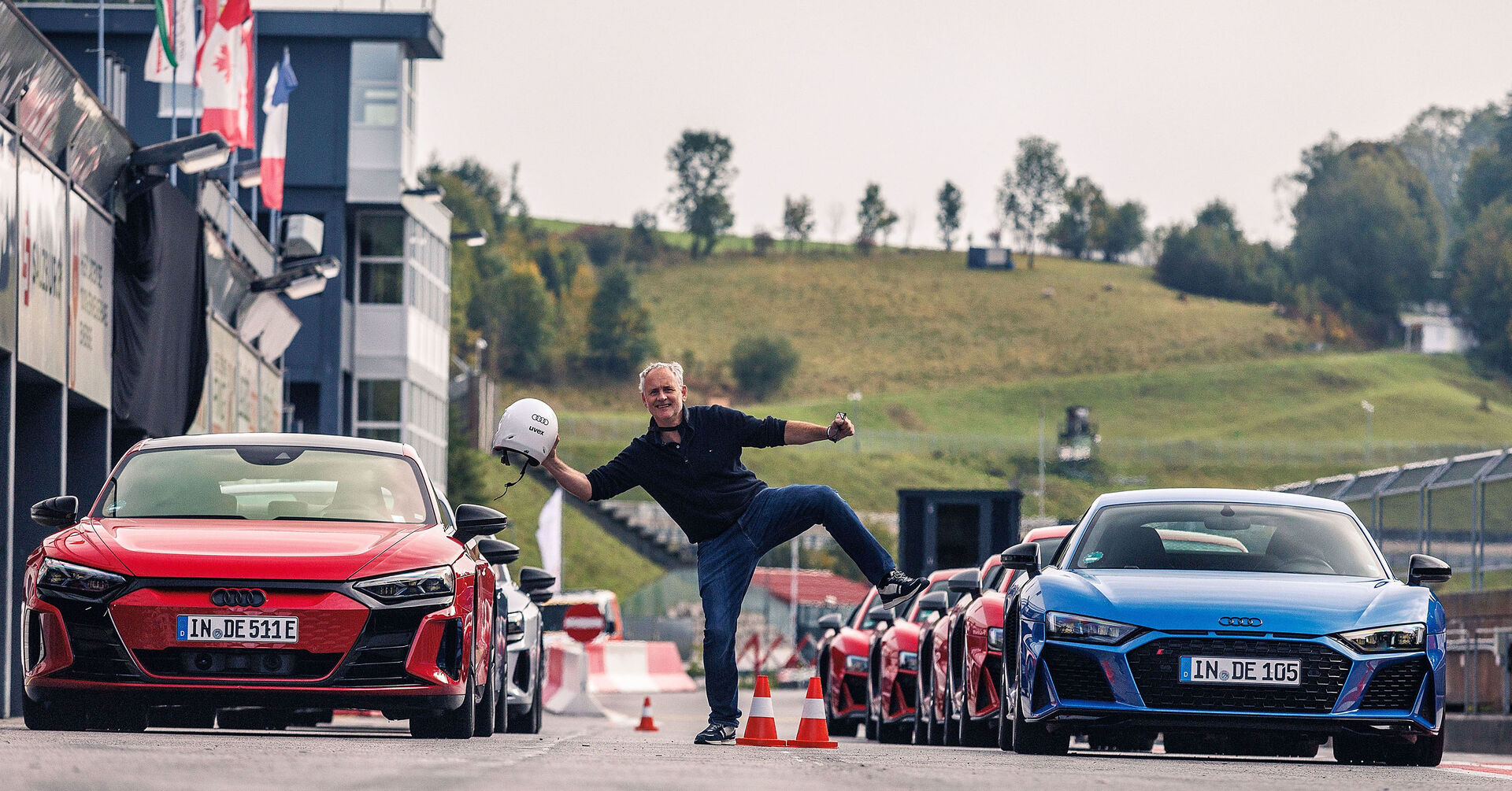 Unterschiedlicher geht es wohl kaum! Auf der einen Seite ein aus der Zeit gerissener V10-Zylinder mit unglaublichen 5,2 Litern Hubraum. Demgegenüber steht ein Elektrosportler mit dem Drehmoment eines Ozeandampfers. Während der V10 als Zweisitzer vorfährt, kann im RS e-tron GT die Familie mitfahren. Ein Vergleich ist schwierig, weil wir von unterschiedlichen Konzepten sprechen. Am Ring. Ja, der Elektro-Audi bringt gute 600 Kilo mehr auf die Waage, was doch einen Unterschied ausmacht. Im Gegenzug liegt der Schwerpunkt durch die im Fahrzeugboden verbauten Batterien tief, was ein Vorteil ist. Sagen wir es so: Der V10 ist ein reinrassiger Sportwagen, ein Saurier, der sich auf der Rennpiste wohl fühlt und sich auch so fährt. Röhrender Sound, brutal gutes Kurvenverhalten – eine Urgewalt. Der Fahrer spürt den Asphalt. Unterm Strich ist man etwas schneller auf der Rennstrecke als mit dem Elektro-Audi.