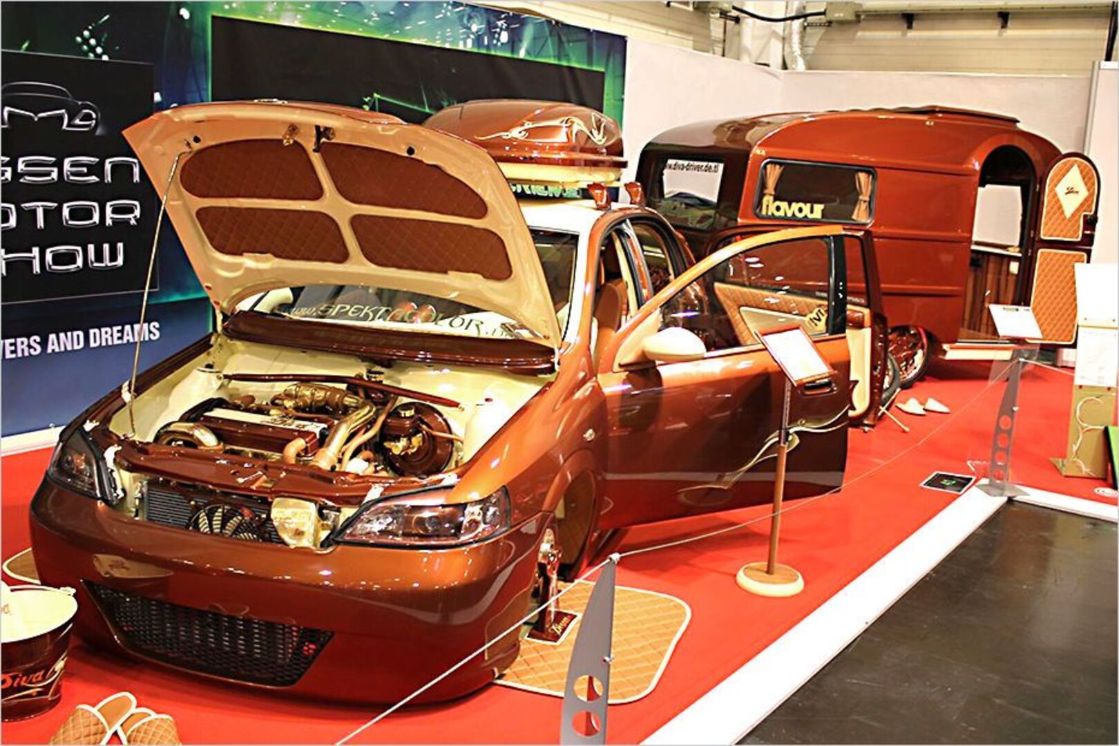 Ein Opel Astra G zum anbeißen. Der Rüsselsheimer von Spektakulor sieht aus wie eine übergroße Schokoladenpraline. Der farblich passende Wohnwagen ist für einen…