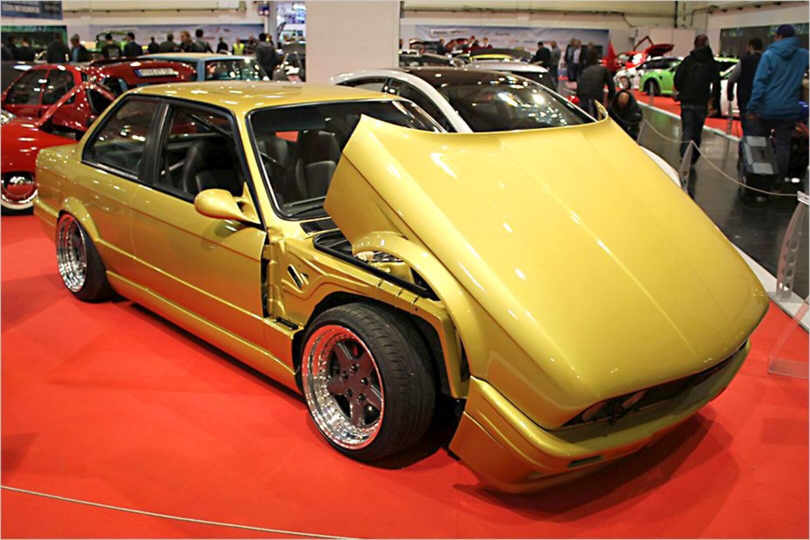 Die Klapprichtung der BMW E30 Motorhaube stimmt schon einmal mit der originalen Richtung überein. Der Rest ist ein Privatumbau. Eine goldgelbe Lackierung und…