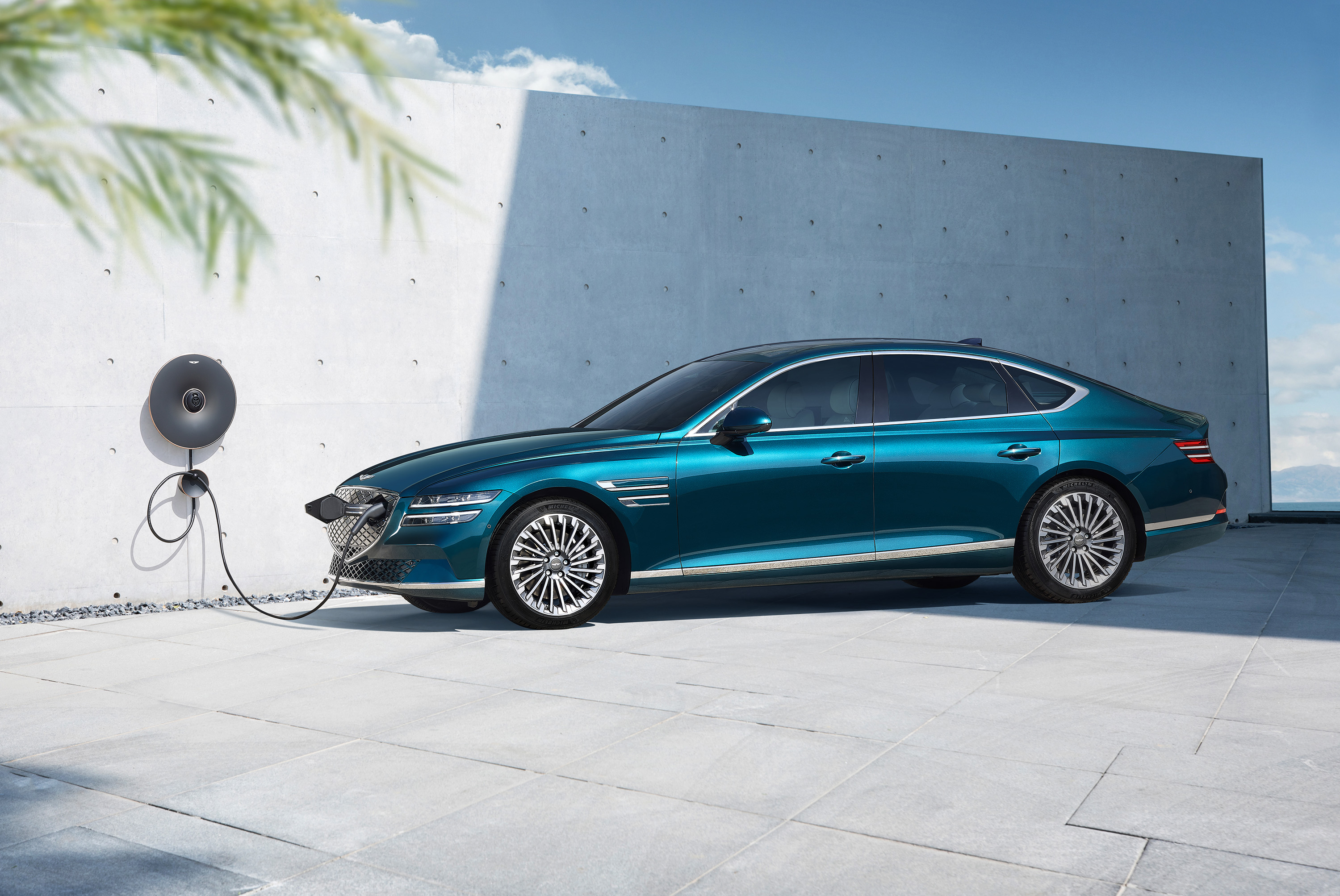 Die Designanleihen bei Bentley sind unverkennbar, sogar das Logo sieht jenem der Briten ähnlich. Unter der Haube der gewaltigen Limousine brummt aber kein V8, sondern es surren mehrere E-Motoren mit einer Gesamtleistung von 370 PS. Der G80 EV ist nämlich serienmäßig ein Allradfahrzeug. Die Batterie bietet eine nutzbare Kapazität von 87,6 kWh, die Reichweite soll damit rund 520 Kilometer nach WLTP betragen (kombinierter Verbrauch 19,1 kWh). Von 0 auf 100 Sachen geht es in 4,9 Sekunden und E-Auto untypisch ist erst bei 225 km/h Höchstgeschwindigkeit Schluss. Geladen wird die Batterie mit bis zu 350 kW, superschnell auch dank 800V-Ladesystem wie im Hyundai IONIQ 5 oder dem KIA EV6.