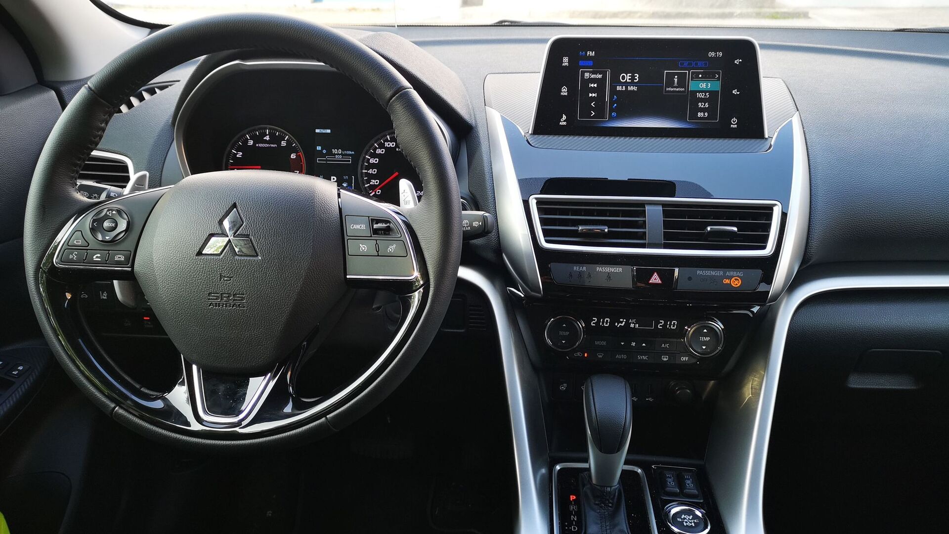 Der Arbeitsplatz des Fahrers ist sehr aufgeräumt und modern. Einzig der jetzt mittig herausstehende Infotainment-Screen ist von der Sitzposition etwas weit entfernt und ohne sich vorzulehnen schwer erreichbar. Dafür gibt es aber neben dem Schalthebel ein Touchpad, mit dem man durchs Menü navigieren kann wie bei einem Laptop. Lenkt auf jeden Fall weniger ab und ist für den Beifahrer eine nette Spielerei. Eines ist beim Infotainmentsystem doch erstaunlich. Die Suche nach einem eingebauten Navi blieb erfolglos. Wir haben schon an unseren Fähigkeiten als Motorredakteure gezweifelt - kann doch nicht sein, dass wir das Navi nicht finden! Wir hätten lange gesucht - der Eclipse Cross in unserer Ausstattungsvariante (Intense + First Edition) hat nämlich keines. Der geneigte Mitsu-Fahrer braucht dafür entweder ein Apple oder Android Smartphone. Dann kann er per Kabel (Wireless geht leider nicht) Apple CarPlay und Android Auto aktivieren und es steht ihm ein vollwertiges Online Navi über das Smartphone zur Verfügung. Ja, das ganze ist sicher zukunftsträchtig aber andere Marken schaffen so ein Navi zu integrieren ohne, dass man ständig mit dem Handy verbunden sein muss. In der höchsten Ausstattungsvariante bietet Mitsubishi aber ein integriertes Navi an. Ansonsten ist die Ausstattung überkomplett: Klimaautomatik, beheizbare Vorderscheibe, mehrere Fahrassistenten, Leder/Stoffsitze, Head-Up-Display, uvm. Die Assistenten wie der Kollisionswarner arbeiten unauffällig gut. Wirklich überrascht hat uns die Rundumsicht. Die Heckscheibe ist geteilt und bietet gute Sicht nach hinten, auch sonst sieht man aus dem Crossover gut raus. Und wem das nicht reicht der hat auch die 360-Grad Kamera im Display.