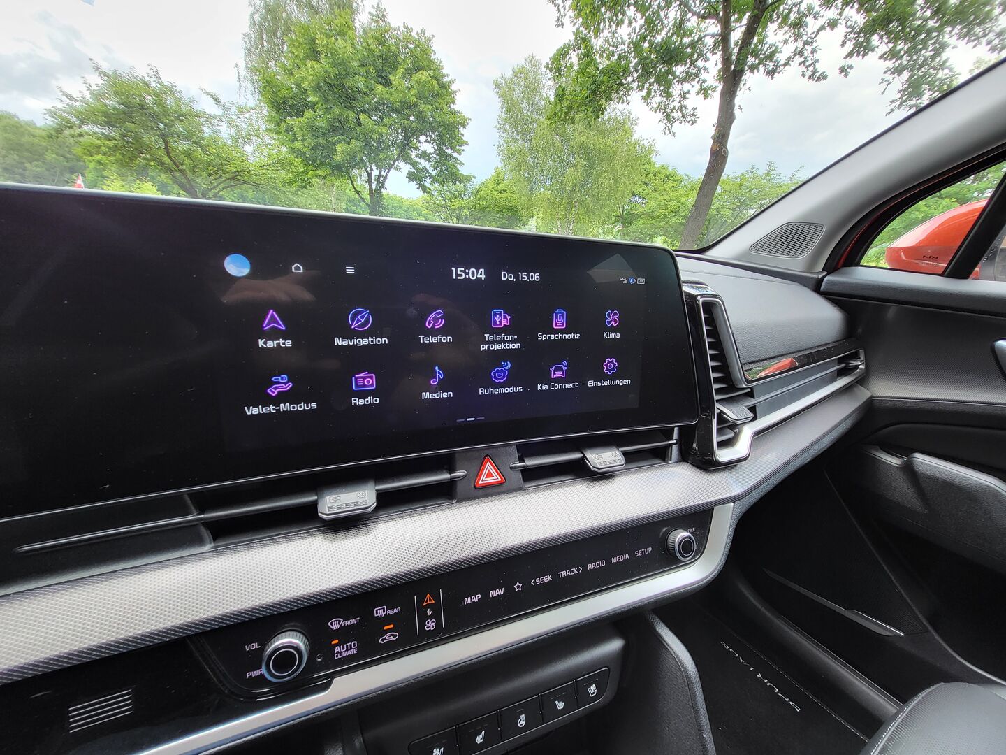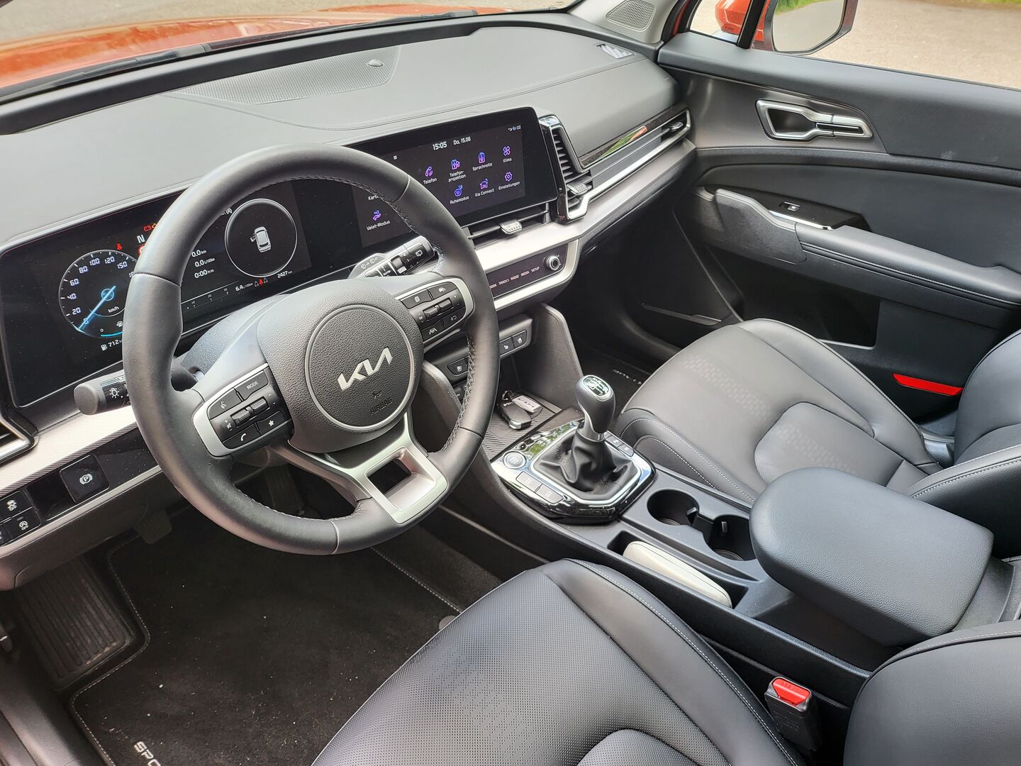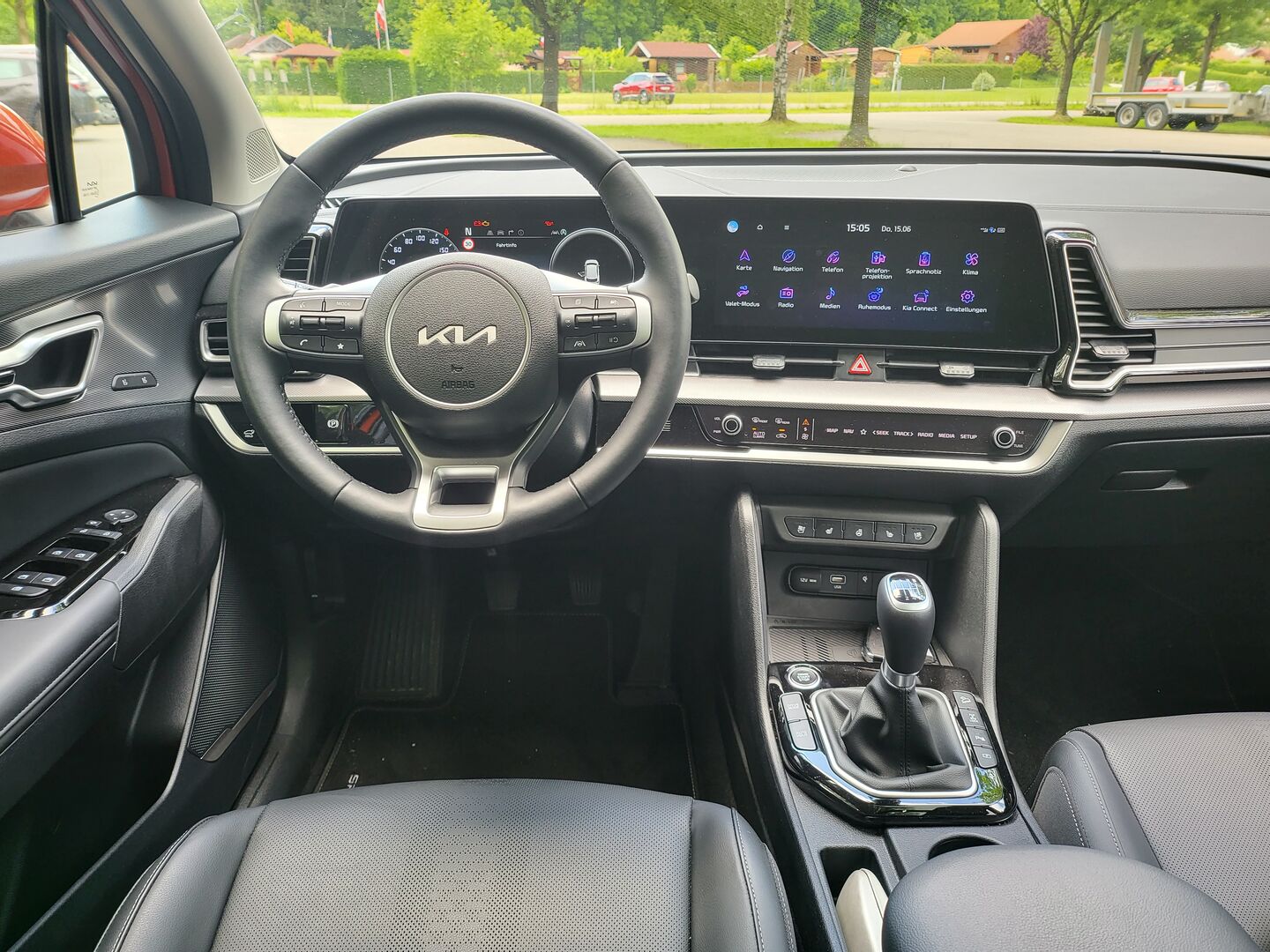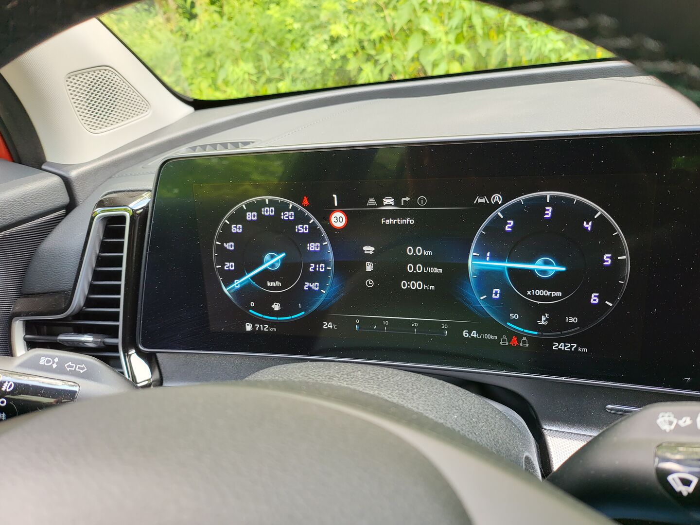Eine kleine Anfahrschwäche beim Ampelstart muss sich der Kia Sportage nachsagen lassen. Allerdings nur bei sehr niedrigen Drehzahlen. Er will also etwas höhere Drehzahlen beim Anfahren. Mag sein, dass dies auch mit dem speziell entwickelten iMT6-Getriebe zusammenhängt. Dieses nutzt eine elektronisch gesteuerte Kupplung, die schon beim Ausrollen den Kia abschaltet. Also nicht nur im Stand, wie wir es von den gewöhnlichen Start-Stopp-System kennen. So wird auch bei höheren Geschwindigkeiten bis 125 km/h gesegelt, wodurch Sprit gespart wird. Von diesen Vorgängen bekommt der Fahrer nix mit. Nur am Drehzahlmesser fällt die „Nadel“ hin und wieder in Richtung Null. Im Test kamen wir mit dieser 48-Volt-Mildhybrid-Technik auf 5,9 Liter, was für ein 4,5 Meter langes SUV ein guter Wert ist. Die Schaltung selbst ist allerdings nicht die knackigste. Was uns überraschte, war der doch flotte Antritt des Diesels. 136 PS klingen in dieser SUV-Klasse nicht unbedingt vielversprechend. Tatsächlich passt der Motor gut zum Auto. Auch in Sachen Lenkung gibt es keine Kritik und das Fahrwerk haben die Koreaner ebenfalls sehr gut hinbekommen. Nicht zu hart, nicht zu weich – gerade so, dass man den Sportage flott bewegen kann. Zu den Assistenten sei noch gesagt, dass ohnehin alles notwendige ab der Grundausstattung vorhanden ist. So kommt das autonome Notbremssystem schon im Einstiegs-Sportage zum Einsatz.