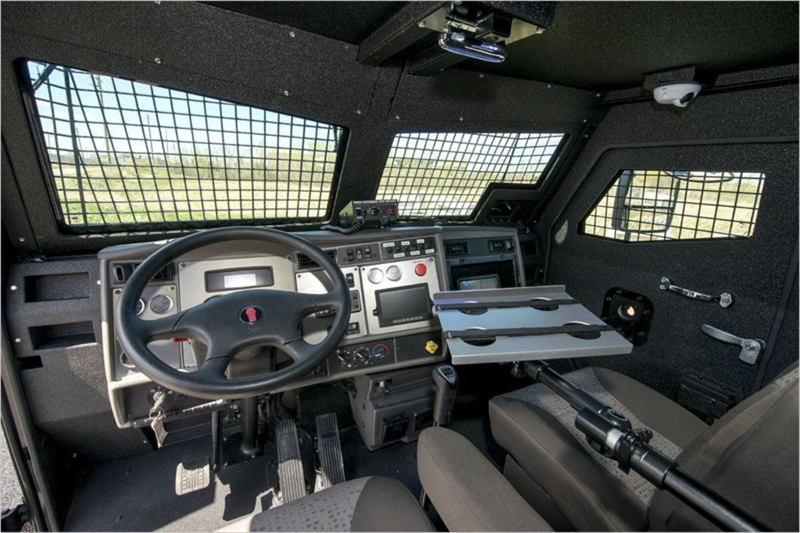 Der Inkas Huron APC kann bis zu 16 Personen transportieren, von denen bis zu zwölf gleichzeitig aus kleinen Schießscharten unterhalb der vergitterten Mini-Fenster auf die Umwelt feuern können. Optional kann auf dem Dach auch ein Geschützturm eingerichtet werden. Die Kabine des Huron widersteht dem Beschuss einer AK-47, der Motorraum ist gepanzert und der Unterboden verträgt die Detonation zweier DM-51-Handgranaten oder Minen von vergleichbarer Zerstörungskraft. Apropos Kraft. Ein 8,3-Liter-Paccar-Dieselmotor verteilt seine Leistung über ein manuelles Zehngang-Getriebe von Allison an alle vier Räder. Der Huron APC soll bis zu 140 km/h schnell sein. Einen möglichen Platten zeigt das Fahrzeug in den Armaturen an, ehe ein Kompressor den betroffenen Reifen automatisch aufpumpt.