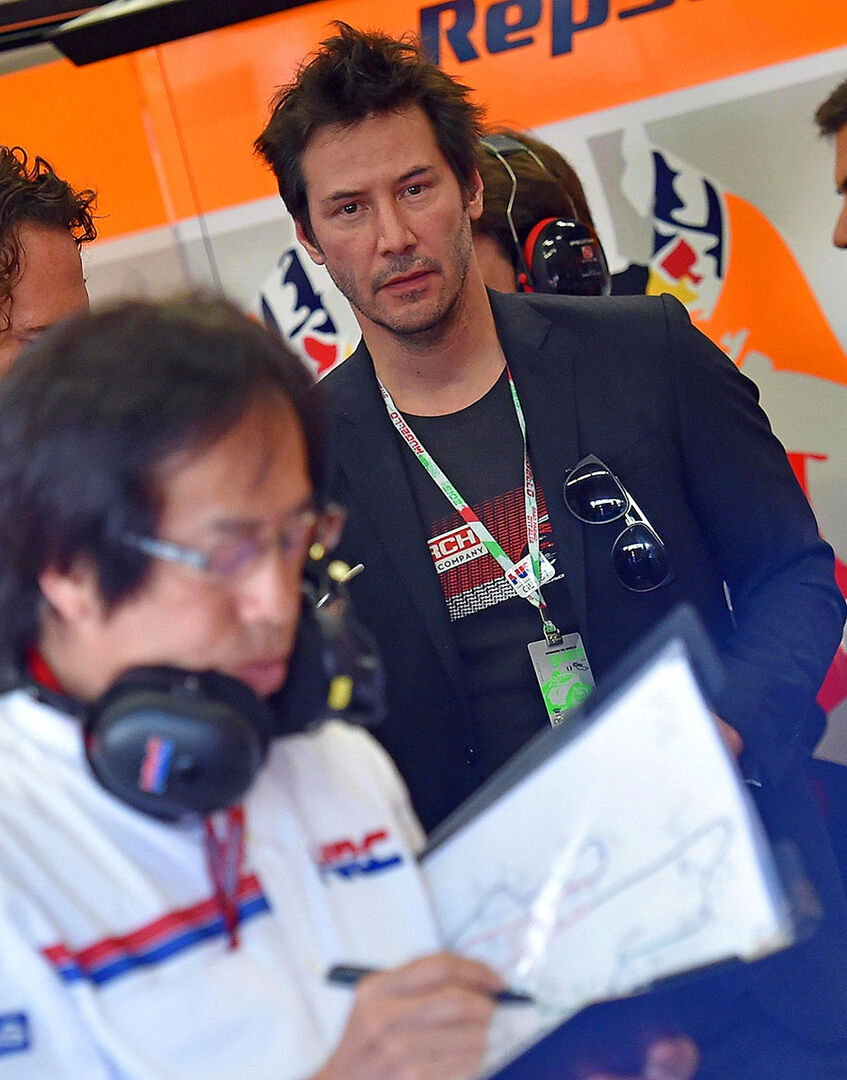 Naheliegend, dass sich Keanu Reeves auch leidenschaftlich für MotoGP interessiert. Hier bei seinem Abstecher in die Box des Honda Repsol-Teams beim Rennen in…