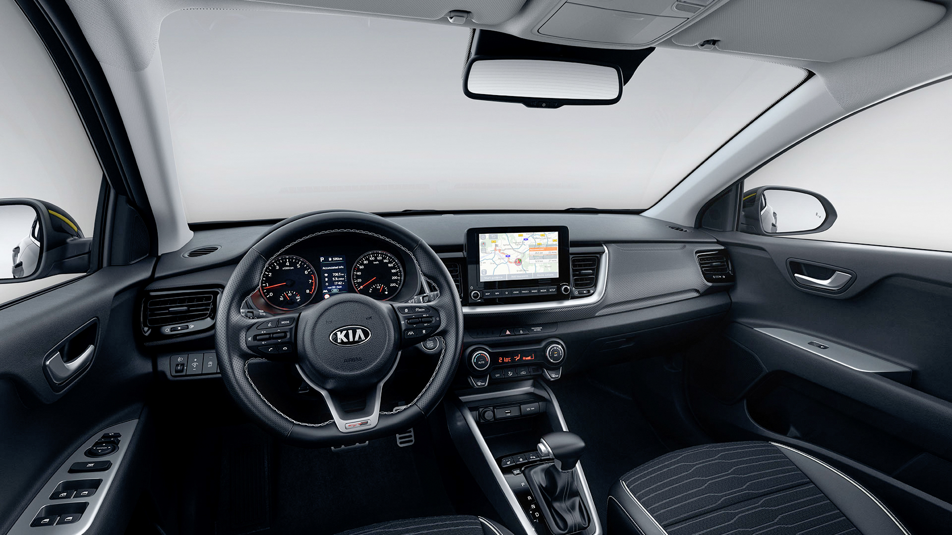 Zu den Innenraumelementen des Stonic GT-Line gehören schwarze Sitzbezüge und Ledernachbildung mit weißen Ziernähten. Standard sind darüber hinaus ein unten abgeflachtes Sportlederlenkrad, ebenfalls mit weißen Nähten. Der Touchscreen ist acht Zoll groß.