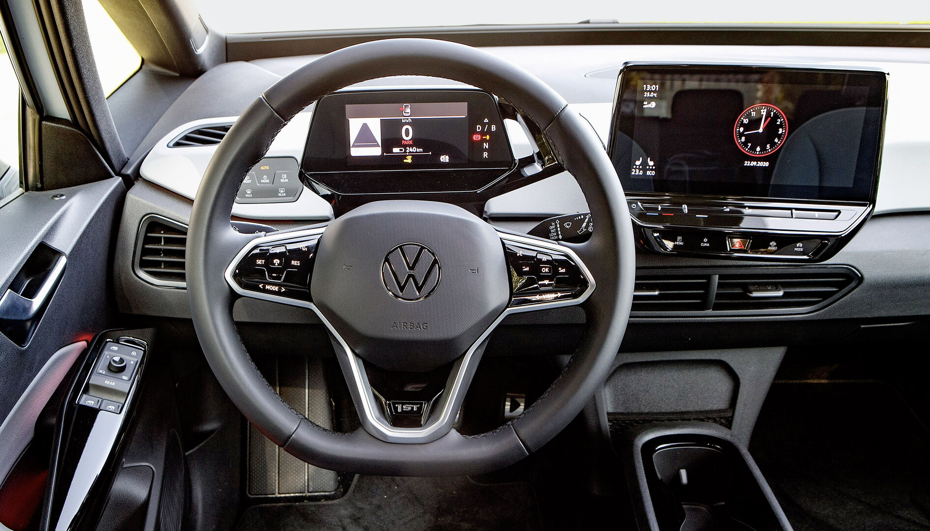 Reichweite. Bei unserem Kurztest fuhren wir den Pro Performance mit 204 PS (58-kWh-Akku) und einer WLTP-Reichweite von 426 Kilometern. Daneben gibt es eine 77-kWh-Version, die bis zu 549 km schafft. Eine kleinere Version kommt 2021. Derart hohe Reichweiten sind nur möglich, wenn man nicht zu viel Gewicht mitschleppt. Neben Einsatz von Leichtbaumaterialien hat Volkswagen deshalb beispielsweise auf Leder im Innenraum verzichtet. Man setzt auf Kunststoff (teilweise aus Recyclingmaterial), der halt auch eher hart daherkommt. Deshalb wirkt das Cockpit nicht unbedingt hochwertig. Gründe dafür sind also Gewicht und Preis – VW hat versucht, Letzteren trotz hoher Akkukosten niedrig zu halten. Geladen wird daheim an der gewöhnlichen Steckdose in etwa 28 Stunden und in 30 Minuten stehen bei 100 kW Ladeleistung 290 Kilometer Reichweite am Screen. Was uns noch aufgefallen ist: extrem gutes Fahrwerk, super Beschleunigung wie bei allen E-Autos (7,3 Sekunden auf 100 Sachen), hinten und vorne gute Platzverhältnisse, toller Wendekreis … Der ID.3 startet ab 34.090 Euro exklusive staatlicher Förderung. Die 77-kWh-Version kostet ab 39.190 Euro.