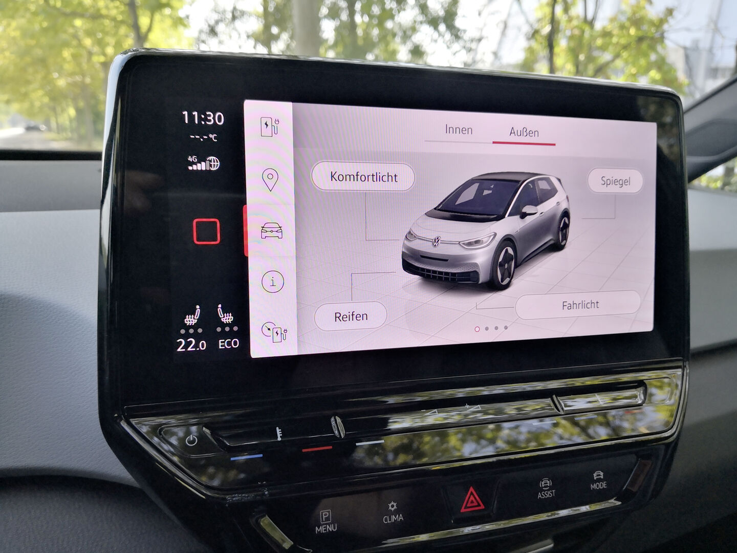 Der neue VW hat eine Art „Arschbremse“. Wenn man den Allerwertesten hebt bremst ID.3 automatisch! Das hängt damit zusammen, dass es keinen Startknopf und keine Handbremse mehr gibt. Der ID.3 erkennt durch das Gewicht am Sitz und durch die Betätigung des Bremspedals, dass es losgeht, und wenn man eben aufsteht „bremst“ er automatisch, weil ja keiner mehr im Auto sitzt. Das zeigt: Der ID.3 geht neue Wege. So sind Knöpfe und Schalter praktisch nicht mehr vorhanden. Alles läuft über die beiden Screens. Die Menüführung ist übrigens so watscheneinfach wie bei den VW-Verbrennern!