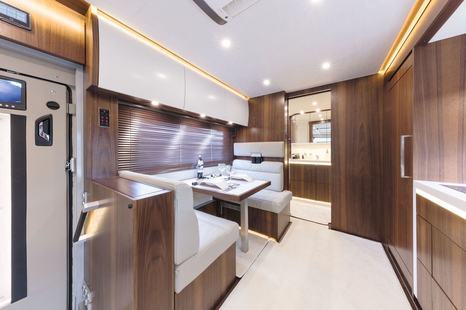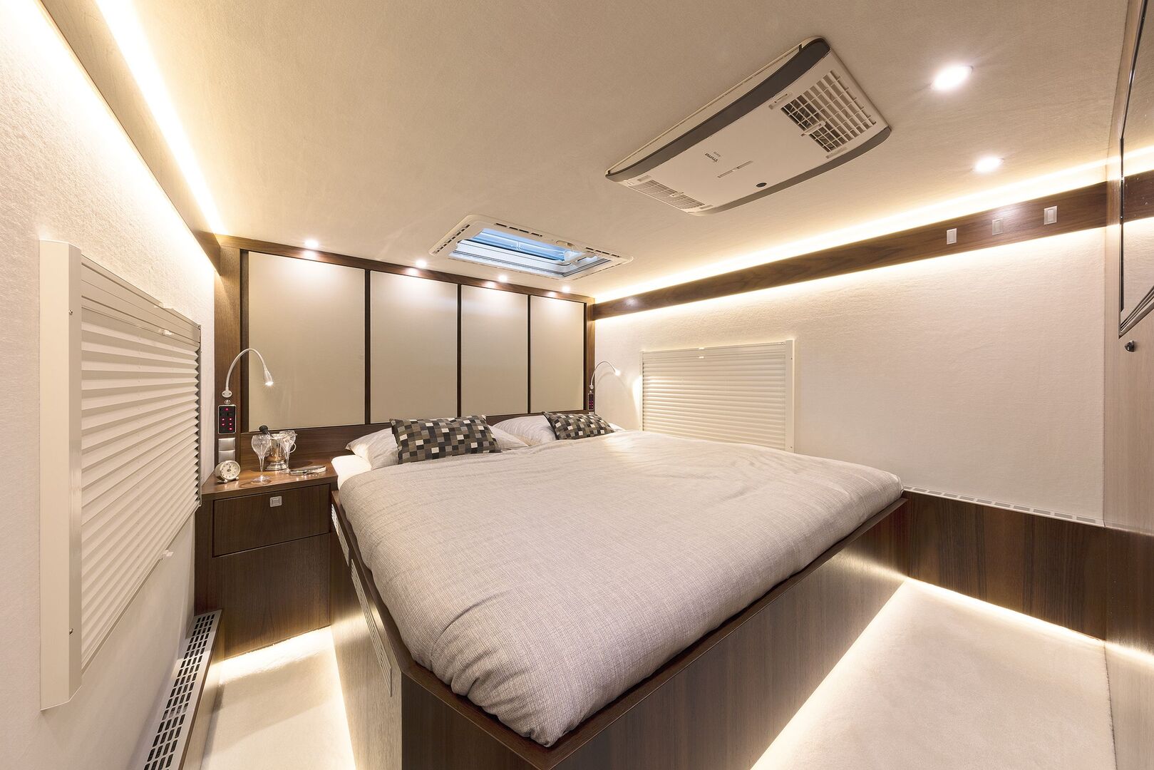 Bis auf Sauna und Fußballplatz bietet der Signature alles, was wir bei uns daheim gerne hätten, aber wir uns nicht leisten können. Dunkle Nusshölzer, Leder an allen Ecken und Enden, Bose-Entertainmentsystem, Ambientebeleuchtung, ein 5-Sterne-Schlafzimmer sowie ein Badezimmer mit Spa-Charakter. Letzteres will auch mit Wasser gefüttert werden. Deshalb hat der Hersteller vorsorglich einen 600 Liter fassenden Wassertank eingebaut! Wer auf das Zimmer für den Buttler verzichtet, kann sich selbst an den hochmodernen Küchen-Multifunktionsblock mit Induktionsherd stellen. Insgesamt, ist das Luxus-Wohnmobil für 4 bis 6 Personen ausgelegt – das darf sich der Käufer bei der Planung aussuchen. Überhaupt wird der Signature hundertprozentig auf die Vorlieben des Kunden abgestimmt. Erwähnt werden sollte auch noch der elektrisch ausfahrbare Erker, der zusätzlichen Wohnraum schafft. Natürlich nur, wenn der Riese still steht.