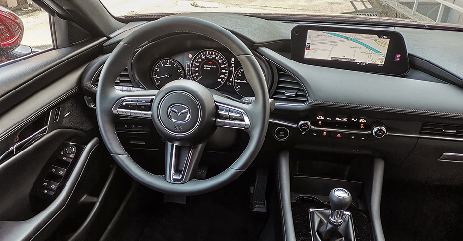 Irgendwo zwischen Tokio und Hiroshima werkt vielleicht in einem Kämmerchen versteckt ein italienischer Designguru und entwirft Autos wie den neuen Mazda3. Der "Alfa Romeo des Ostens" wirkt jedenfalls so, als hätten Europäer Hand angelegt. Nicht nur im Bereich Außenhaut, auch in puncto Cockpit legen die Japaner im 3er einiges vor. Mazda meint, man habe das Cockpit-Design an jenes der Formel 1 angelehnt. Zum Glück in Bezug auf Fahrerzentriertheit und Überblick. Alles ist schon fast brutal einfach zu bedienen – kompliziert ist nur die Bezeichnung des 8,8-Zoll-Schirms auszusprechen (MZD Connect Infotainmentsystem). Dieser ist im Bereich der Mittelkonsole leicht nach links versetzt angebracht. Dadurch wendet der Fahrer den Blick nicht zu sehr von der Fahrbahn ab. Zudem gibt es kein doofes Herumfingern in diversen Untermenüs. Gesteuert wird sehr logisch via Controller. Der Materialmix geht ganz klar in Richtung Premium – man greift schon in der Grundausstattung tief in die Ausstattungskiste. Heißt: Der relativ hohe Grundpreis resultiert daraus, dass das Einstiegsmodell eher als Spitzenmodell durchgeht. An Bord sind serienmäßig Head-up-Display, 8,8-Zoll-Farbdisplay, Navi, Müdigkeits-, Fußgänger- und Verkehrszeichenerkennung, Spurhalteassistent oder auch Notbremsassistent.