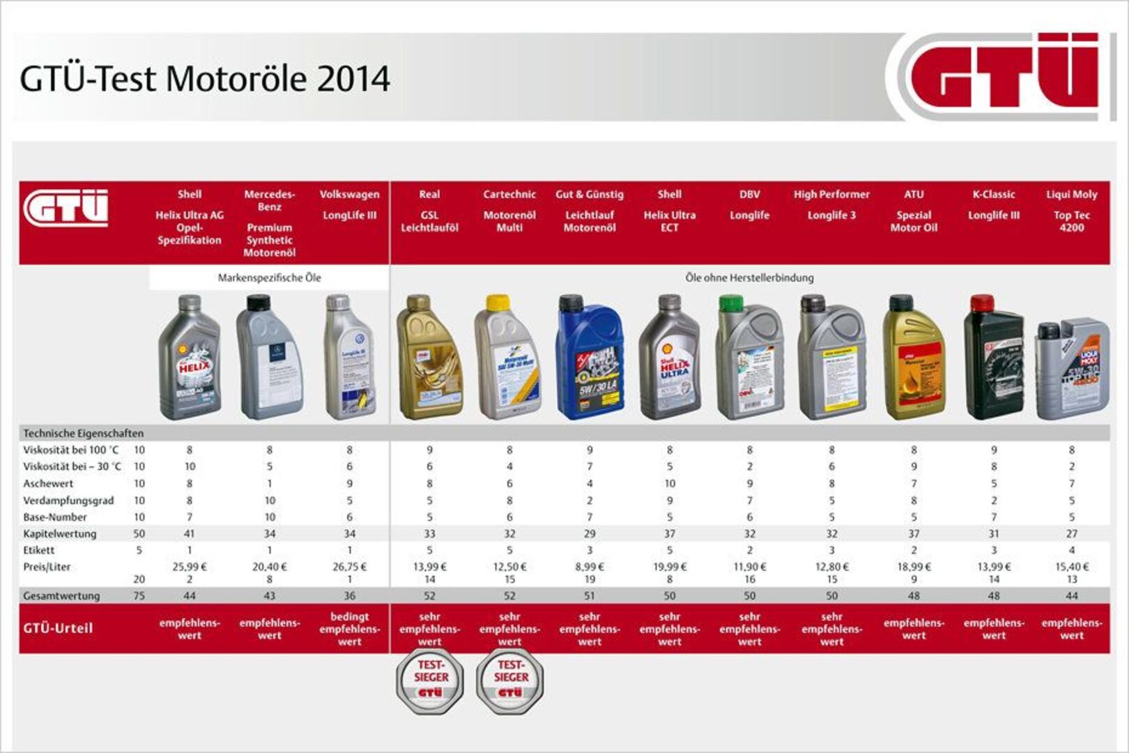 Zwölf handelsübliche Motoröle von 8,99 bis 26,75 Euro pro Liter wurden unter die Lupe genommen. Das Fazit der Experten: Der Verdacht, preisgünstige Motoröle seien nur halb so gut wie teure Markenöle, ist unbegründet. Denn die Testsieger sind No-Name-Produkte: das GSL Leichtlauföl der Handelskette Real für 13,99 Euro pro Liter und das Cartechnic Motorenöl Muli für 12,50 Euro je Liter erhielten beide die Bewertung "sehr empfehlenswert". Ebenfalls mit "sehr empfehlenswert" schnitten die Motorenöle DBV Longlife für 11,90 Euro und High Performer Longlife 3 zu 12,80 Euro ab. Teure Markenöle mit Literpreisen von weit über 20 Euro, wie beispielsweise die von Shell, Mercedes und VW, erreichten im GTÜ-Urteil lediglich ein "empfehlenswert" oder "bedingt empfehlenswert".