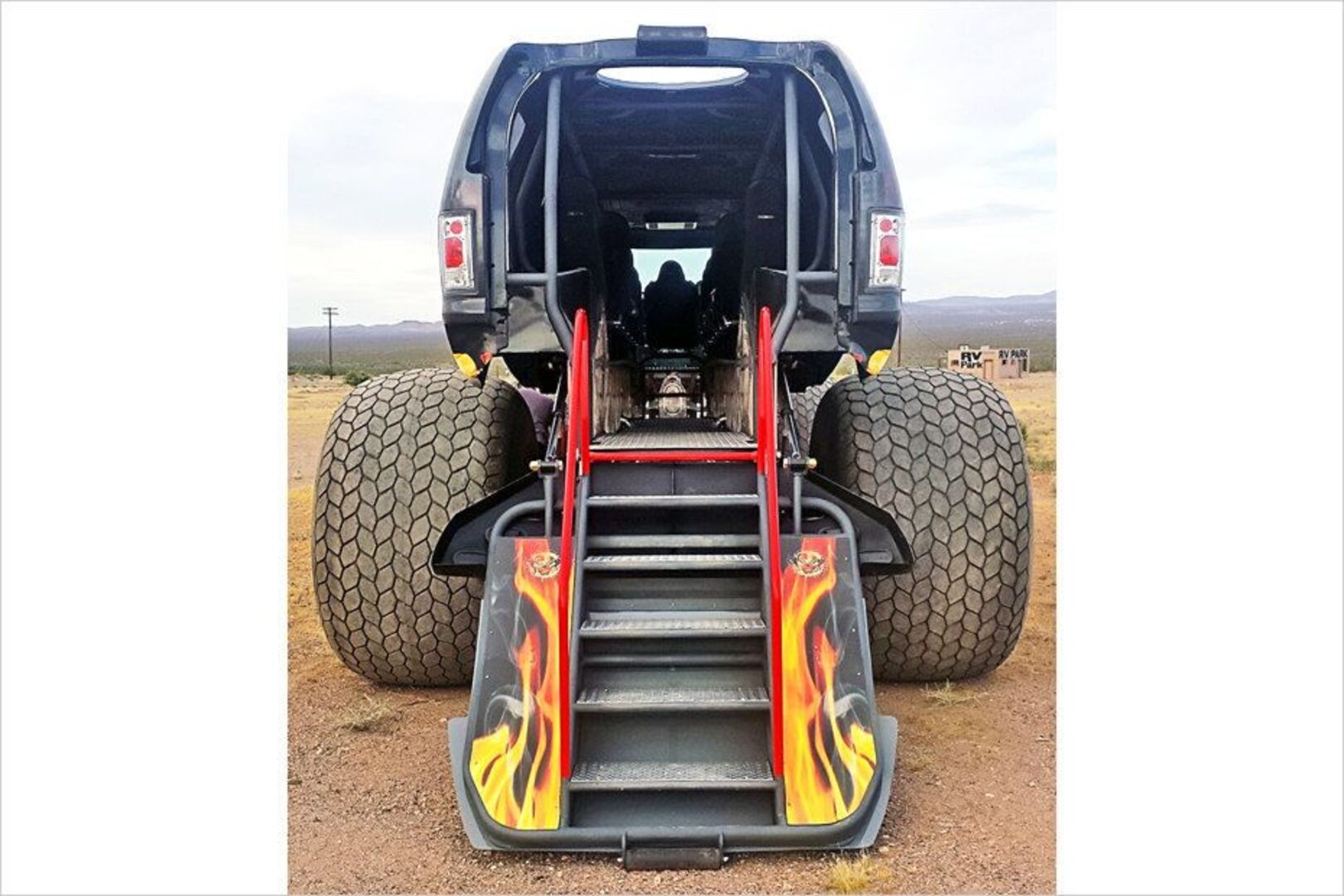 Auch wenn nicht mehr allzu viel daran erinnert, der "Sin City Hustler", eine Art Las Vegas auf Riesenrädern, war mal ein Ford Excursion. Das komplett neu aufgebaute Einzelstück hat einen 8,5-Liter-V8 mit 700 PS unter der Haube. Eine gewisse Gemütlichkeit erzeugen schicke Schalensitze und immerhin vier Türen mit elektrischen Fensterhebern. Für ein Restmaß an Wendigkeit sorgt die Vierradlenkung.