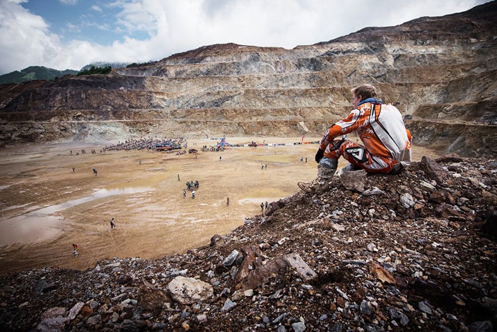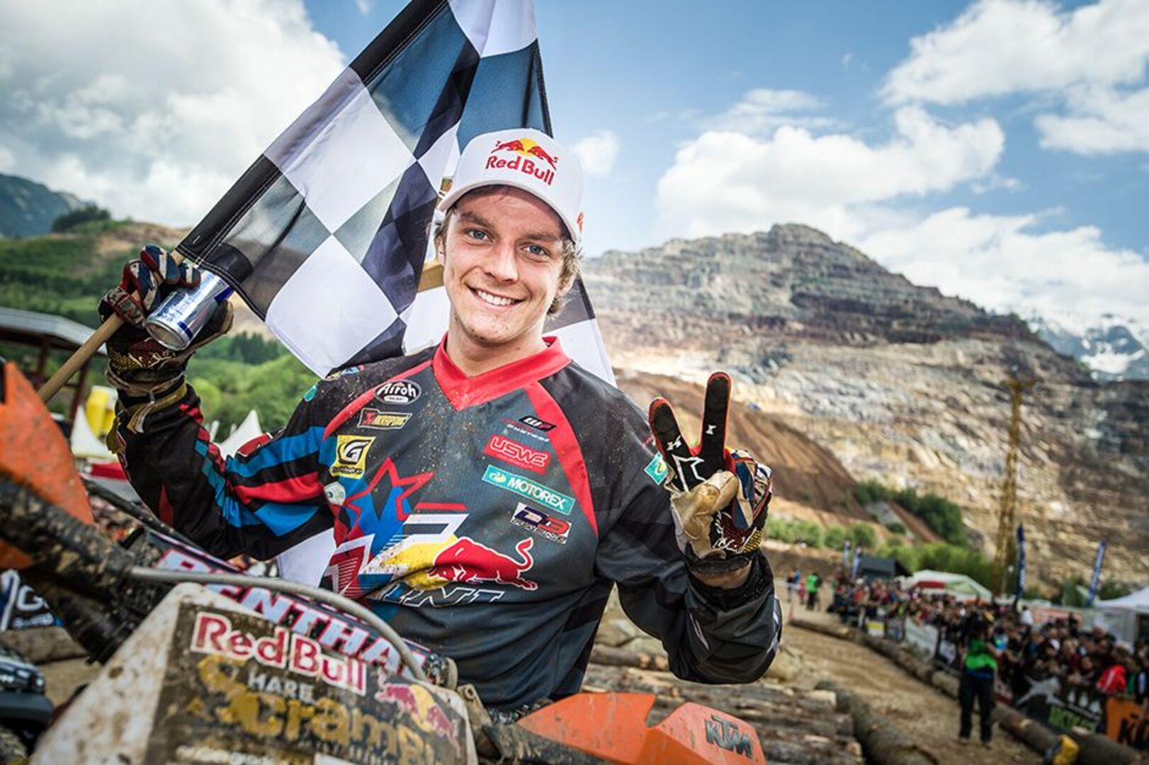 Beim Start des Red Bull Hare Scrambles ging es gleich ordentlich zur Sache. Durch tiefen Schlamm und Wasser ging es rasant um die Kurve und den ersten Schotteranstieg hinauf. So mancher Rider aus der ersten Startreihe hatte schon hier seine liebe Mühe und purzelte samt Motorrad rückwärts den Hang wieder hinunter. Der Steirer Seppi Fally meisterte diese Passage am besten, und setzte sich überraschend vor dem hochkarätigen Starterfeld in Führung. Diese währte jedoch nicht lange – nach einem Sturz von Fally übernahm der junge Brite Jonny Walker Platz eins.