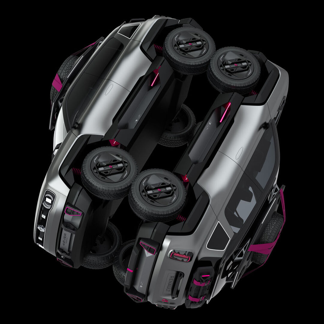 Mit nur 26 PS fuhr der alte Renault 4 auf unseren Straßen. So gesehen sin die 136 PS dieser Studie schon fast monströs. Und natürlich werkt im Motorraum kein Vierzylinder-Benziner. Der 4EVER Trophy wird rein elektrisch angetrieben. Die Energie kommt aus einer 42 kWh-Lithium-Ionen-Batterie. Rein optisch gibt sich der Renault 4EVER so, als müsste er in die Wüste zur französischen Fremdenlegion, um dort auszuhelfen.