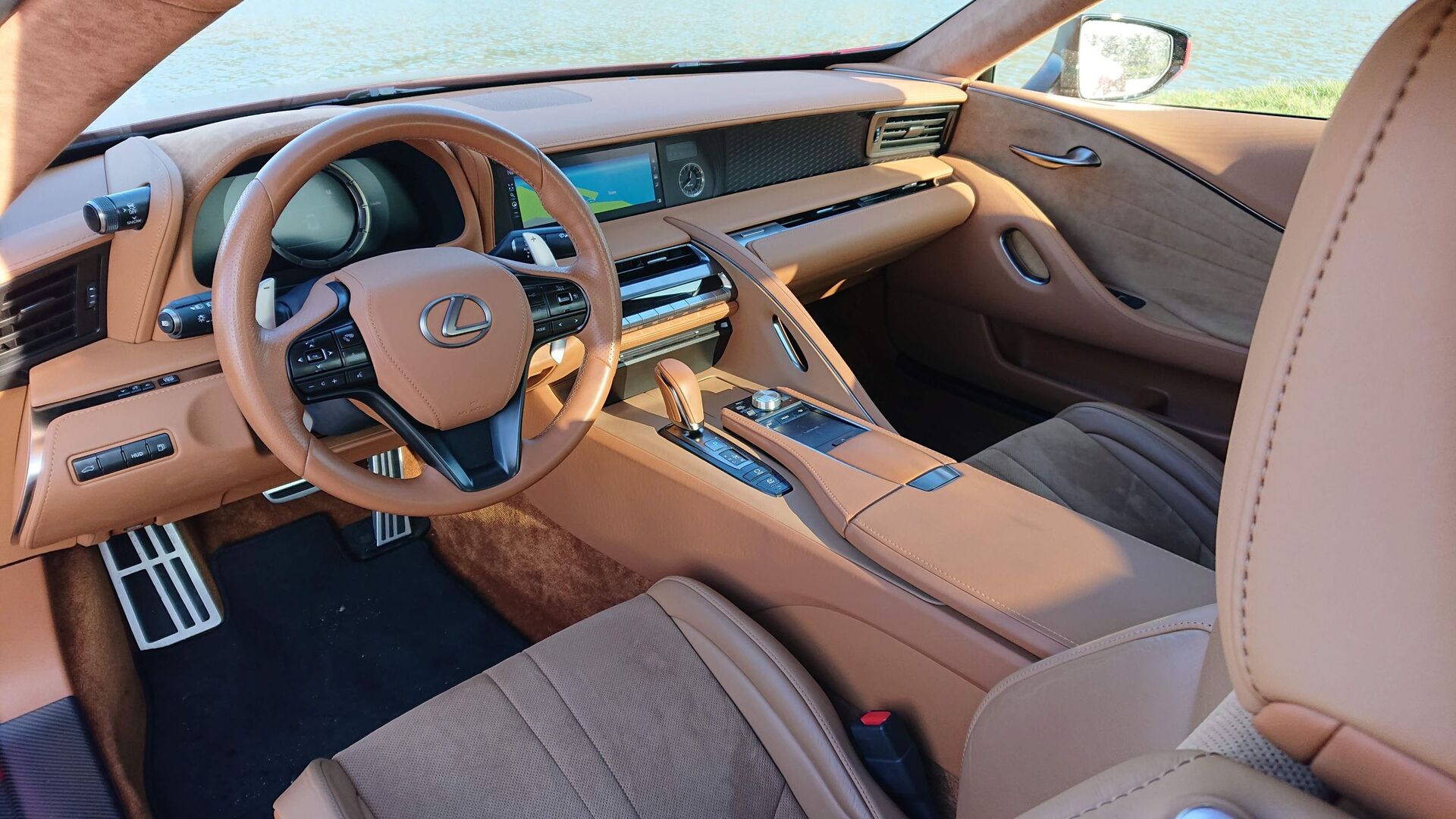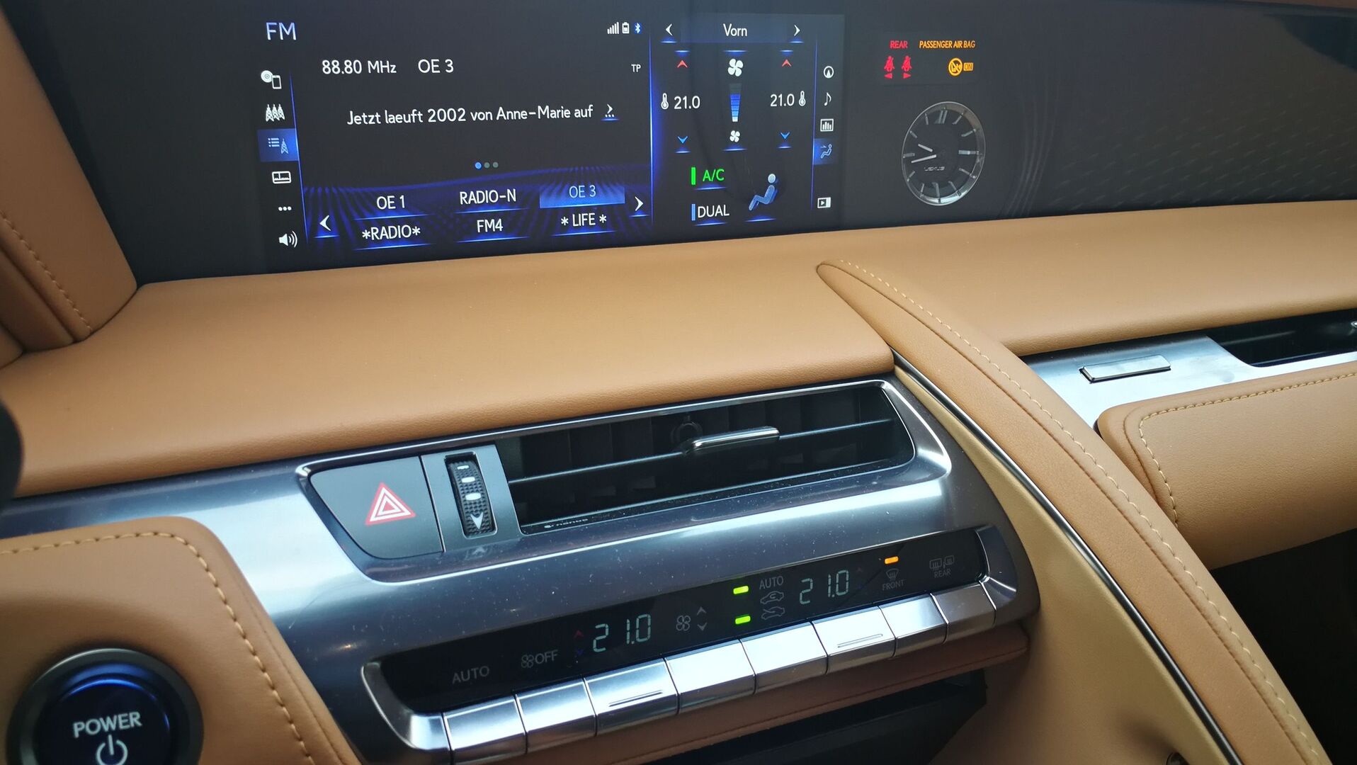 Der Inenraum begrüßte uns in einem edlen Braun und viel Leder. Die Verarbeitung war mehr als in Ordnung und kann definitiv mit anderen Premiummarken mithalten. Einzig das Infotainmentsystem ist bei der japanischen Nobelmarke leider eine Pein. Die Bedienung per Touchpad ist dermaßen umständlich, dass wir anstatt des integrierten Navi manchmal aufs Smartphone ausgewichen sind. Schade, denn ansonsten bietet der 10.3-Zoll große Touchscreen eine gute Auswahl an Informationen und fügt sich passend in die schön gestaltete Cockpitlandschaft ein. Die hinteren Sitze des LC500h dienen eher als Transportplatz für größere Taschen als für ausgewachsene Mitfahrer. Vvorne ist genug Platz. Auch für größere Herr- und Damschaften. Die Hintersitze wird man eher wegen des doch klein geratenen Kofferraums brauchen. Sagen wir es so - für den monatlichen Biereinkauf nimmt der Lexusfahrer von Welt eher den Zweitwagen.