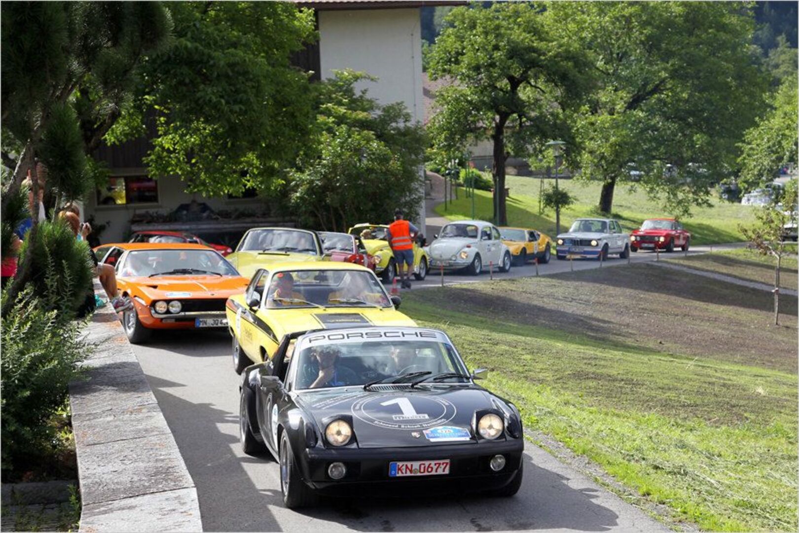 Zu einer Oldtimer-Rallye gehören auch Wertungsprüfungen. Davor kann es sich auch schon einmal stauen, was die Zuschauer freut. Ganz vorne steht hier ein VW…