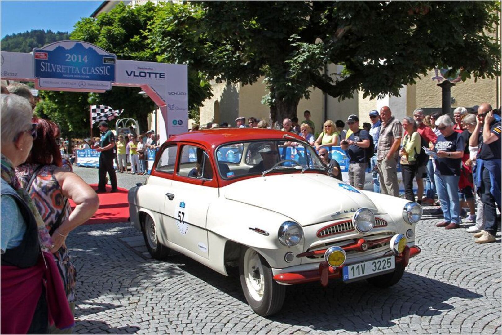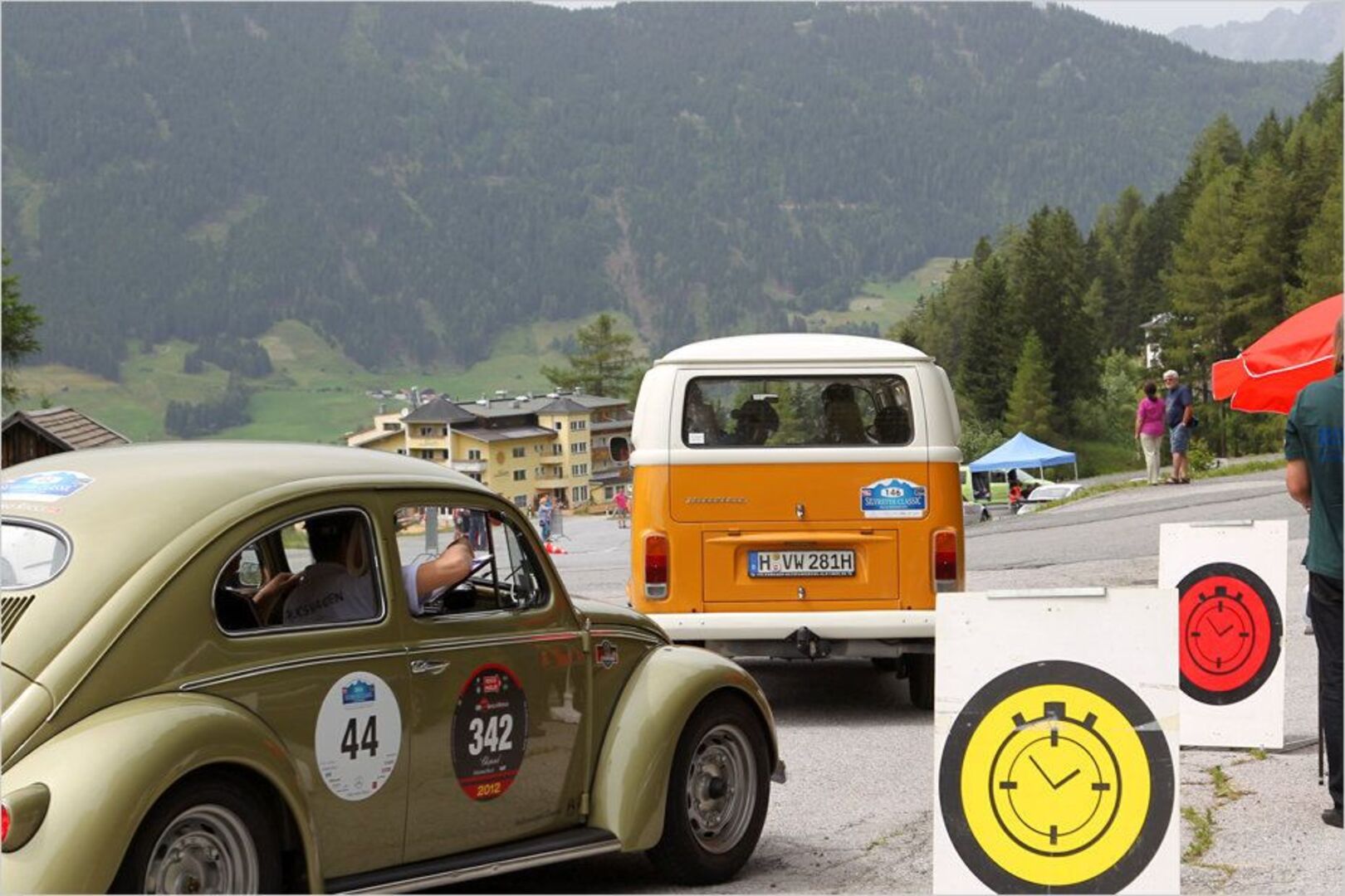 Einfahrt zur Zeitkontrolle: Hier ist Pünktlichkeit gefragt, sonst drohen Strafpunkte. Der VW Bus im Hintergrund ist dem Filmauto von "Little Miss Sunshine"…
