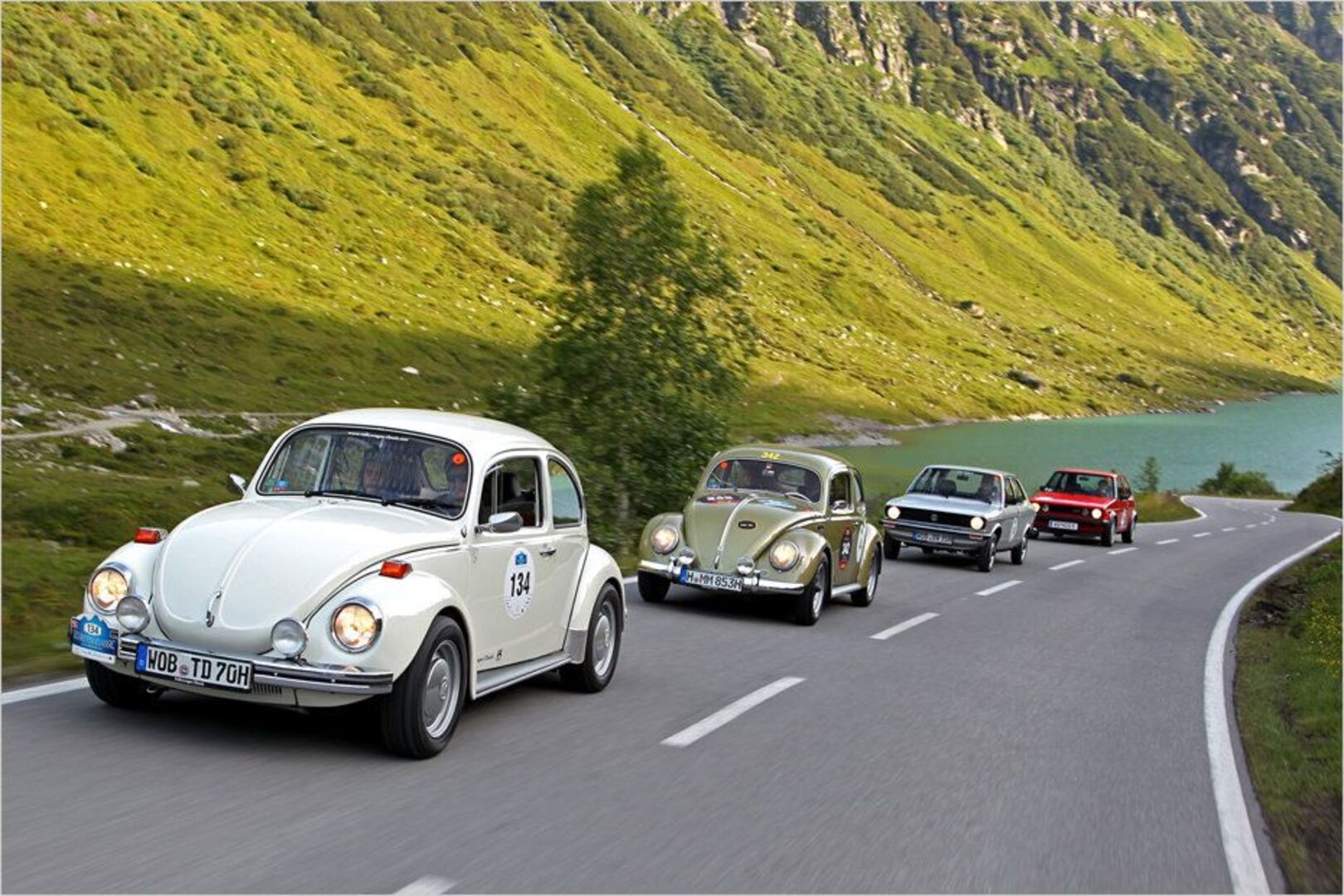 Gruppenbild mit dem VW-Starterfeld der Silvretta Classic 2014: Ganz vorne der von Theo Decker auf 135 PS frisierte VW Käfer 1302 S, dahinter der Mille-Miglia…