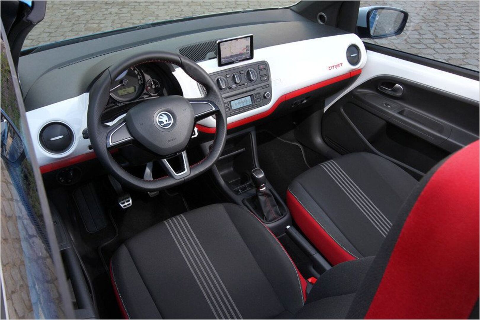 Die Innenausstattung stammt vom Citigo-Sondermodell "Sport". Dazu gehören ein rot vernähtes Lederlenkrad mit unten abgeflachtem Kranz sowie Ledermäntel an Handbremsgriff und Schaltknauf. Sitzbezüge und Fußmatten sind in einem auffälligen rot-schwarzen Stoffdesign gehalten, die Instrumententafel ist weiß-rot lackiert. Und noch eines ist deutlich sichtbar: Die Skoda-Fachleute von morgen mögen Licht: LEDs in den Fußräumen leuchten im Takt der Musik. Außen gibt es blau leuchtende Nebellampen vorn, außerdem strahlen blaue Lampen unter den Schwellern den Boden an.