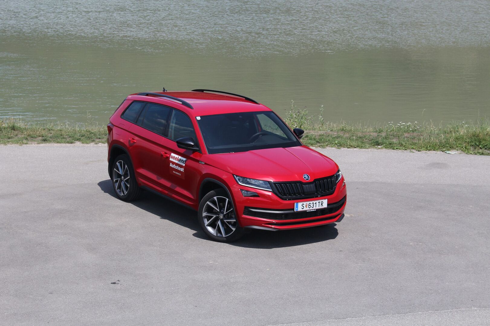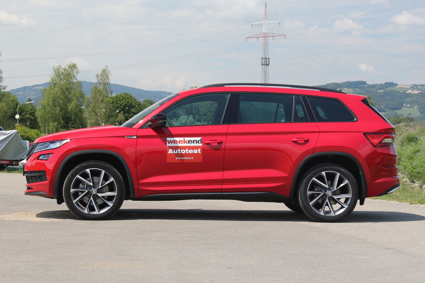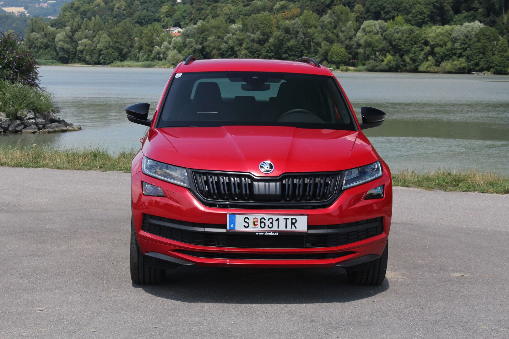 Wenn Sie unter Agoraphobie leiden – Angst vor großen, weiten Orten – dann sollten Sie den Kodiaq meiden. Wir hatten den Kodiaq zwar schon als Testfahrzeug, sind aber trotzdem wieder überrascht von den Platzverhältnissen des SUVs. Nicht nur die bis zu 2.065 Liter Kofferraumvolumen machen sich gut, auch Fahrer und Beifahrer dürfen großwüchsig sein. Und auf der Rückbank sind die längsten Stelzen kein Hindernis. Mehr geht auf 4,7 Metern Länge kaum, ohne dabei optisch in der Klein-Lkw-Klassse zu landen. Mit dem Kodiaq hat es Škoda geschafft, ein mehr als ansprechendes SUV-Design hinzuzaubern, das mit der Sportline verfeinert wird.