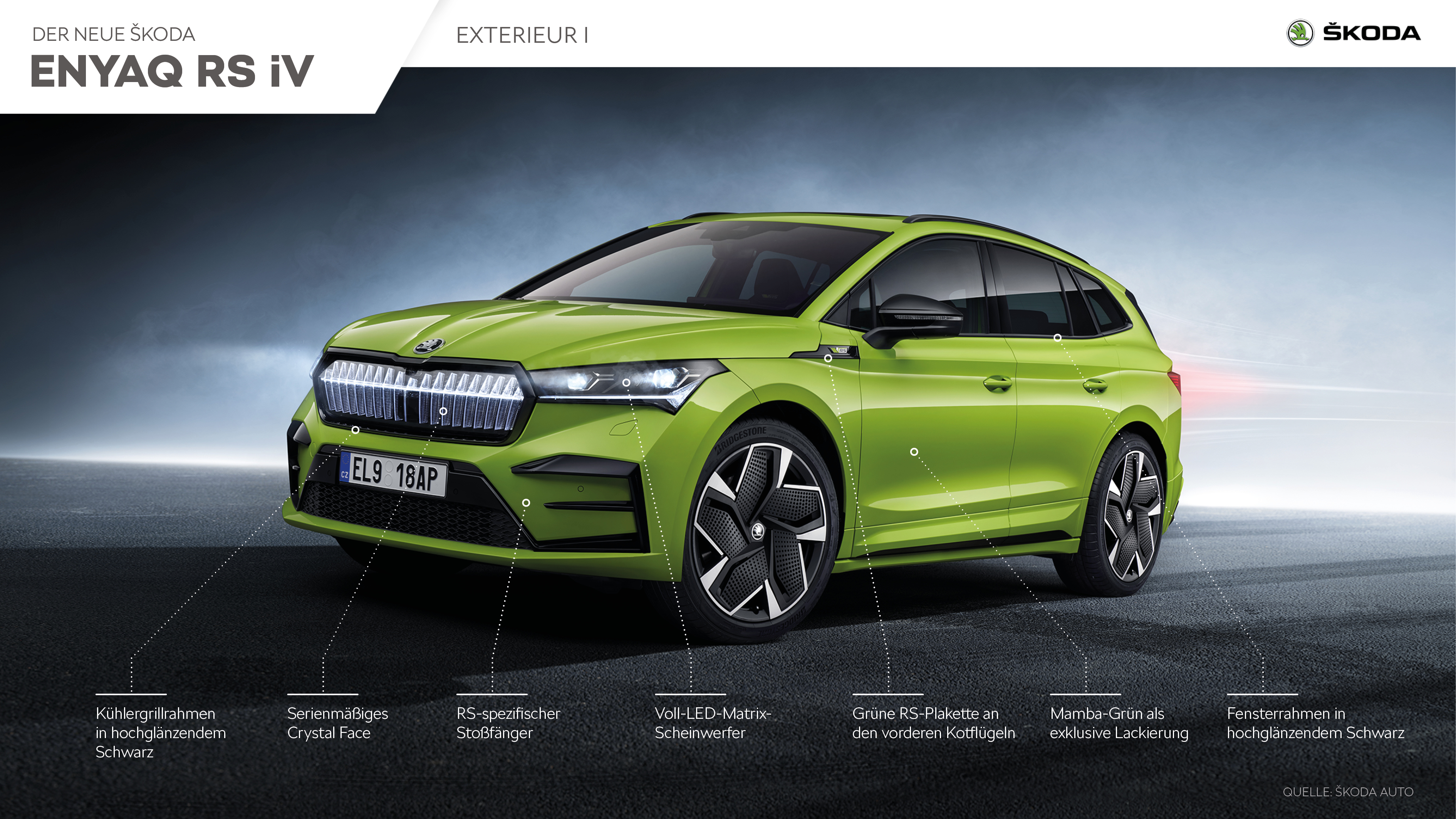 Die vorderen Kotflügel zieren exklusive grüne RS-Logos und das Crystal Face gehört beim ENYAQ RS iV zur Serienausstattung: 131 LEDs beleuchten die vertikalen Rippen sowie die horizontale Leiste des ŠKODA-Grills. Sie fügen sich in den animierten Welcome-Effekt der Voll-LED-Matrix-Scheinwerfer und der Voll-LED-Heckleuchten ein, die beim RS-Modell jeweils serienmäßig an Bord sind.