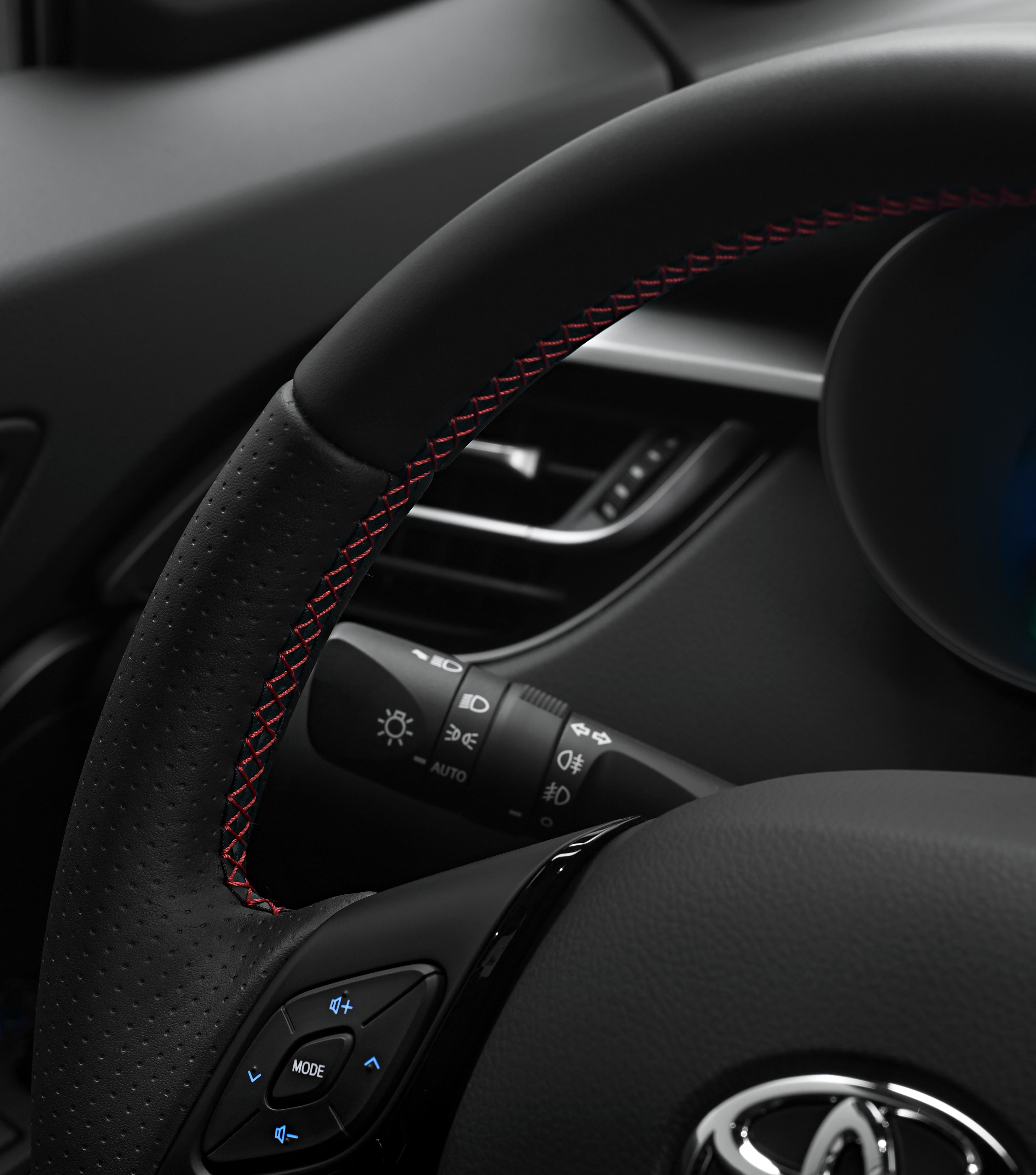 Beim Design greift Toyota in die Vollen und schärft den Außenauftritt des sowieso nicht gerade unauffälligen C-HR weiter. Viel Schwarz, einige Klavierlackoptionen und eine Prise Sportlichkeit zeigen das selbstbewusste Aufftreten des C-HR GR Sport. Der Innenraum ist in sportlichem Schwarz mit viel Silber gehalten und bietet hochwertige Alcantara Sitze mit den kontrastierten roten Ziernähten und dem GR-Logo. Der Startknopf kommt ebenso aus dem Gazoo-Racing-Regal.