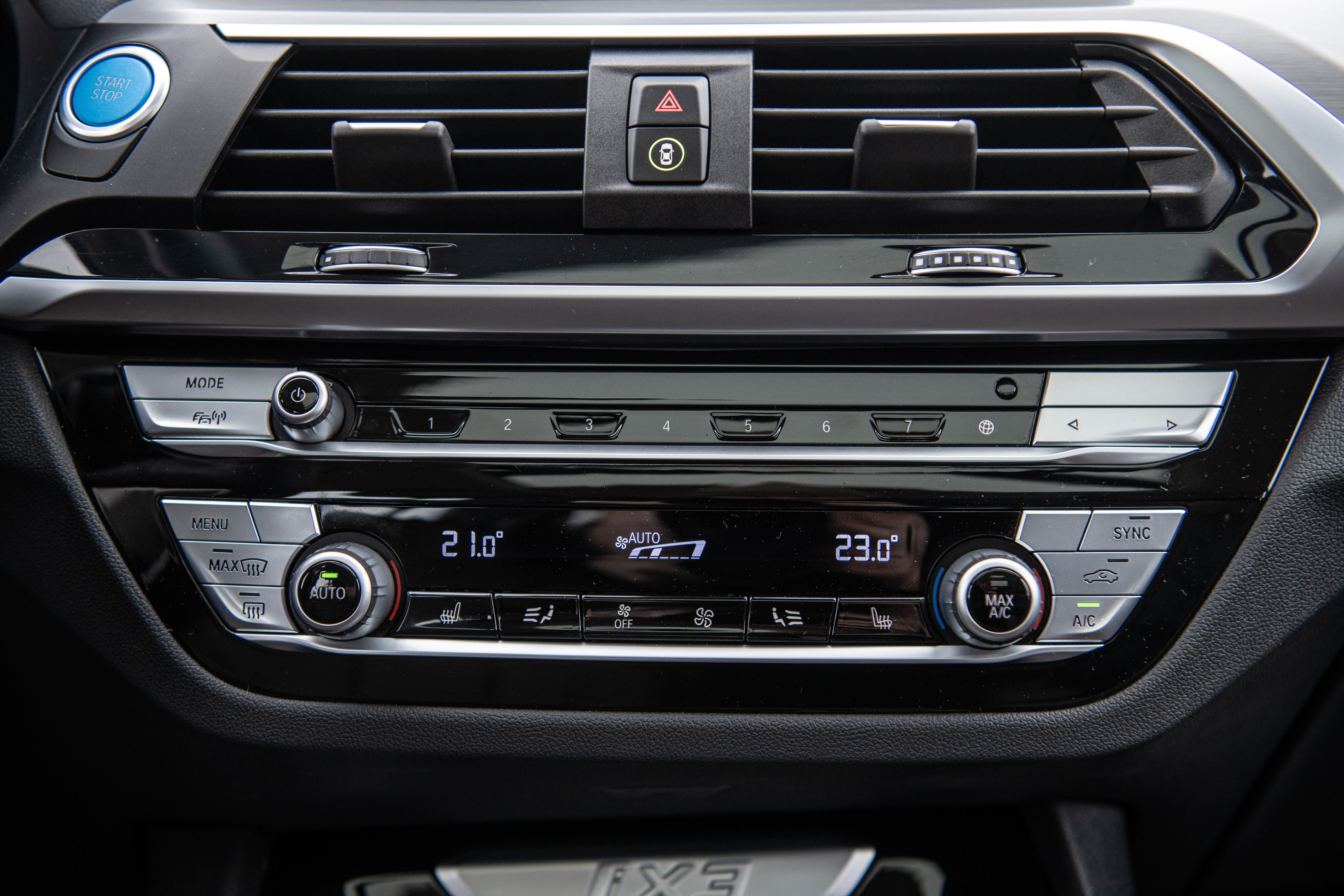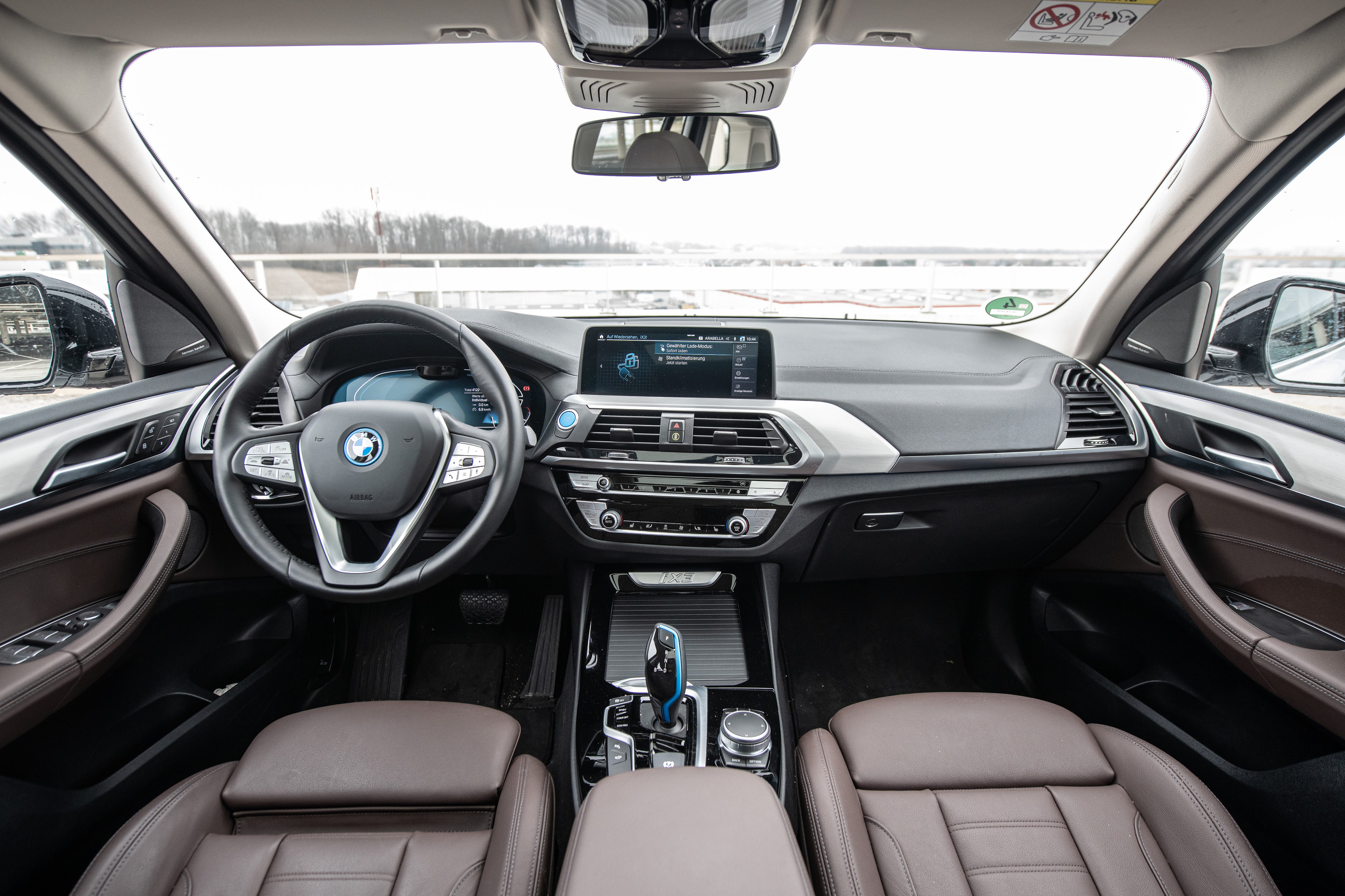 Die Innereien. Innen ein echter X3 – viel Leder, alles brutal sauber verarbeitet. Nur, wie gesagt, der blaue Startknopf, das Blau am Automatikhebel und die Elektro-Untermenüs am Screen verraten, dass da was elektrisch fährt. Die Screens sind so, wie wir es aus den Verbrennern von BMW kennen. Assistenten gibt es bis zum Abwinken. Serien sind beispielsweise: Geschwindigkeitsregelung mit Bremsfunktion, Speed Limiten, Park Assistant Plus sowie das ganze Paket Driving Assistant Professional. Die Screens sind so wie wir es aus den Verbrennern von BMW kennen.
