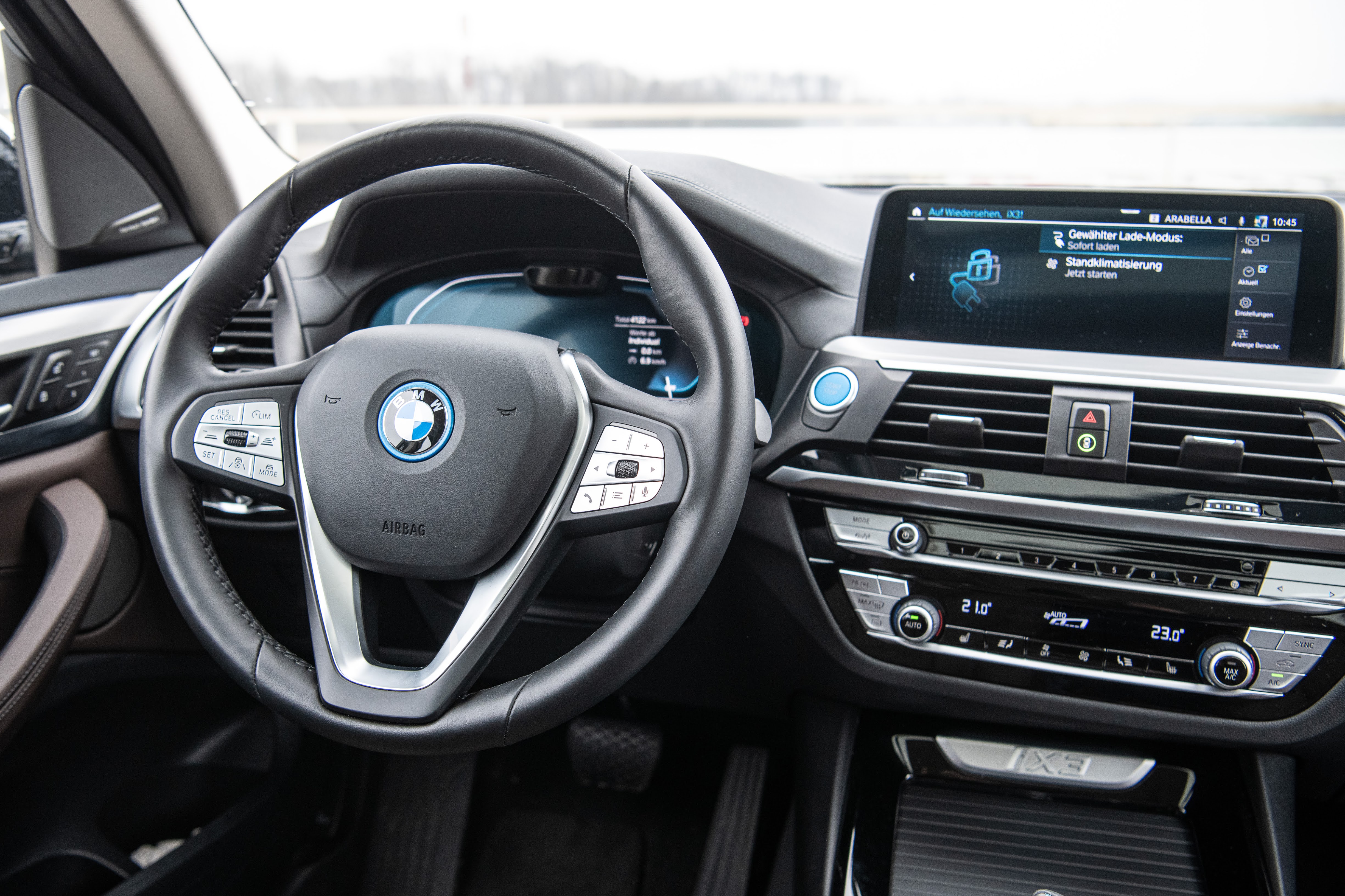 Reichweite. Die angegebenen Reichweite (460 Kilometer) konnten wir, wie bei fast allen anderen E-Auto-Tests, natürlich nicht erreichen. Aber im Schnitt lagen wir bei niedrigen Temperaturen bei einem Verbrauch von 20 bis 23 kWh. Das ergibt eine Reichweite von etwa 350 bis 400 Kilometern. Ohne Heizung ginge da noch mehr. Alles natürlich davon abhängig, ob man in der Stadt die Stärken des E-Bayern ausspielt oder auf der Autobahn mit 180 Sachen (was ohnehin plemplem wäre) bolzt. Auf der hügeligen Landstraße lagen wir hinsichtlich Verbrauch bei erfreulichen 20 kWh. Ein guter Wert, denn der iX3 steht in Sachen Ausstattung der normalen X3-Version um gar nichts nach. Leder und hochwertige Materialien an allen Ecken und Enden. Das treibt eben auch das Gewicht in die Höhe. 2.185 Kilogramm sind es. Verglichen mit anderen E-Autos (SUVs), dieser Größe aber ein mehr als annehmbares Gewicht. Dies dürfte auch damit zusammenhängen, dass BMW die Energiedichte der Batterien vergrößert hat - was Gewicht spart.