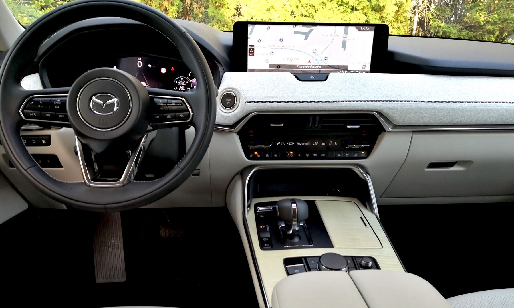 Der Innenraum des CX-60 ist ziemlich interessant gestaltet, weil er nicht mit der Masse mitschwimmt. In der getesteten Version hatten wir beispielsweise unterhalb des Armaturenbretts einen hellgrauen, speziellen Stoffbezug mit noch spezielleren Nähten. Dazu hat Mazda helle Holzapplikationen verbaut. Dazu weiße Ledersitze und schon wirkt alles extrem edel. Man will da eindeutig Richtung Premiumsegment. Die Verarbeitung ist ganz klar hochwertig und das Design im Innenraum wirkt eben sehr modern und aufgeräumt! Und typisch Mazda: anders als derzeit viele Hersteller verzichtet man auf Untermenüverwirrspiele, Touchscreenablenkungen und Knopferlwald. Die Bedienung erfolgt über den Controller im Bereich der Mittelkonsole. Im Cockpit stechen zwei sehr große Screens ins Auge. Hauptinstrument und Multifunktionsscreen haben beide jeweils 12,3 Zoll. Was gibt es zu meckern? Die Sicht nach hinten könnte besser sein. Ohne Rückfahrkamera wäre es etwas „fad“ rückwärts zu fahren. Und die Lenkung könnte etwas direkter sein, man kurbelt beim Wenden do etwas lange herum. Sonst gibt es keine gröberen Beanstandungen. Das Wort Platzproblem kennt der CX-60-Fahre nicht. Kein Wunder, bei den Abmessungen.
