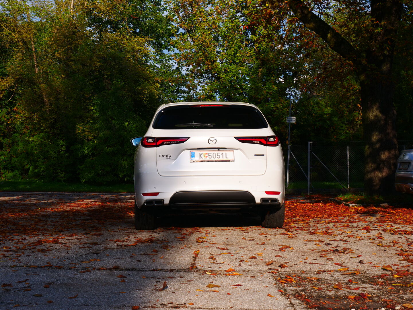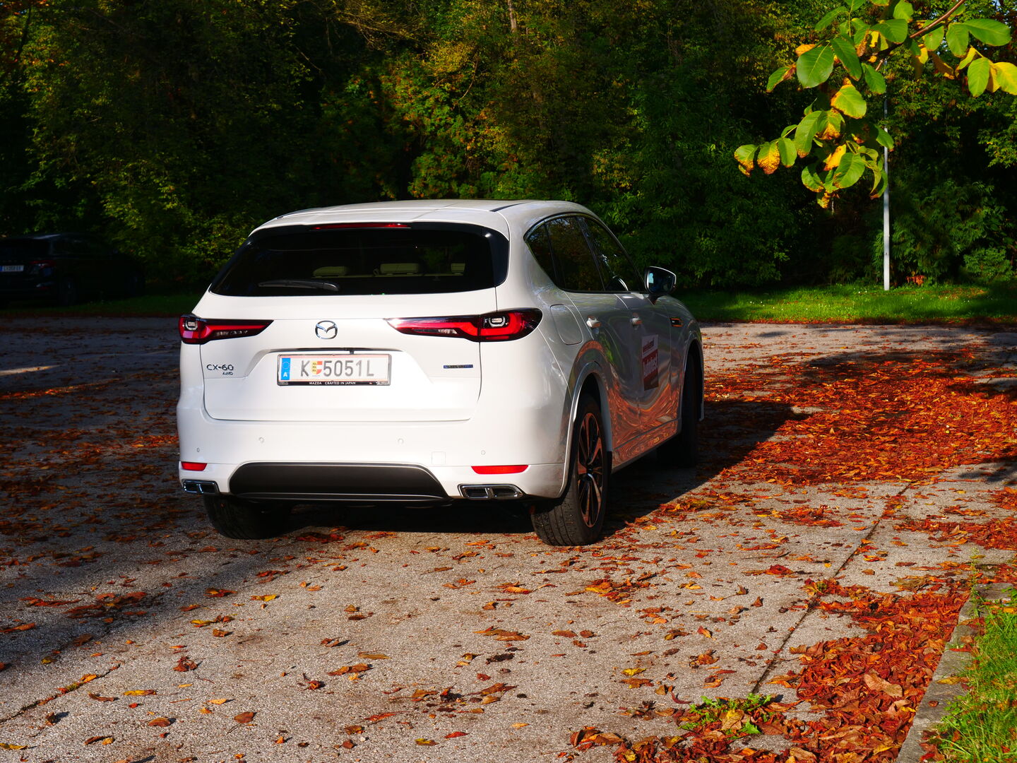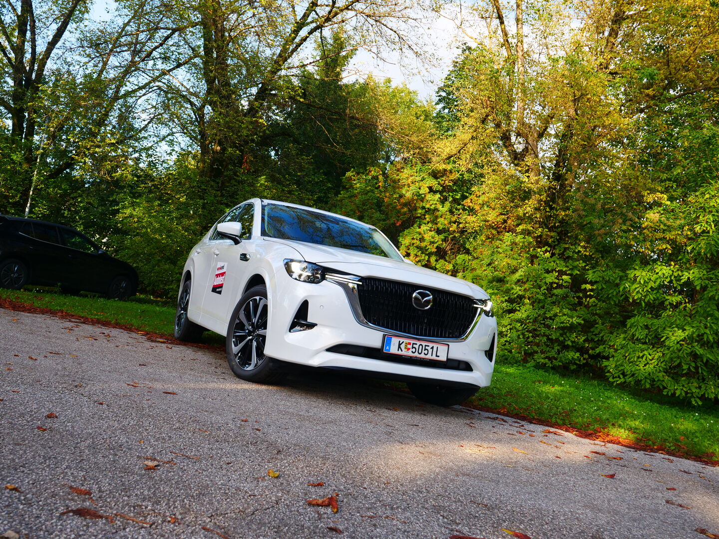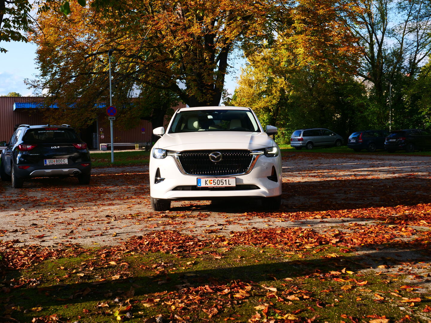 Was fällt uns beim ersten Blick ins Gesicht des Big-SUV ein? „Friss mich nicht!“ … Ja, der Kühlergrill ist schon ziemlich mächtig. Mächtig sind aber auch die Eckdaten. 327 PS Systemleistung, 2,5-Liter Hubraum und eine Beschleunigung von 0-100 km/h in 5,8 Sekunden. Mit 4,75 Metern Länge ist der CX-60 ein ziemliches Bröckerl. Das merkt man bei der Parkplatzsuche. Und trotzdem ist der CX-60 kein Säufer, denn wir sprechen hier von einem Plug-In, der eine ziemlich stolze rein elektrische Reichweite bietet. Auch in Sachen KFZ-Steuer steht einem kein Schweiß auf der Stirn, denn die Systemleistung setzt sich aus 191 PS vom Benziner und den 175 PS aus dem E-Motor zusammen. Im Test schafften wir zwar die angegeben 63 Kilometer rein elektrische Reichweite nicht, aber gut 55 Kilometer, was im Vergleich zu anderen Plug-In Hybriden ein stolzer Wert ist. Möglich wird dies durch eine 17,8 kWh-Batterie, die mittig im Fahrzeugboden verbaut wurde. Das Laden dauert aber schon eine Weile, da die Ladeleistung bei 7,2 kWh liegt. Heißt: es dauert ca. zweieinhalb Stunden, bis man die gesamte elektrische Reichweite zur Verfügung hat. So wird aber auch gleichzeitig die Batterie geschont – Batterien werden ja durch diverse Schnellladungen nicht wirklich besser. Zudem macht der Plug-In ohnehin nur Sinn, wenn der Besitzer daheim über Nacht laden kann. Und hier ist es egal, ob eine oder zwei Stunden geladen wird.
