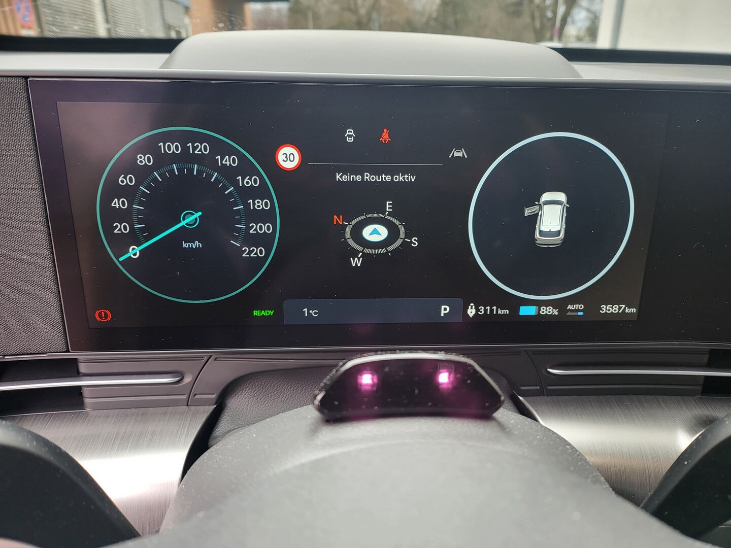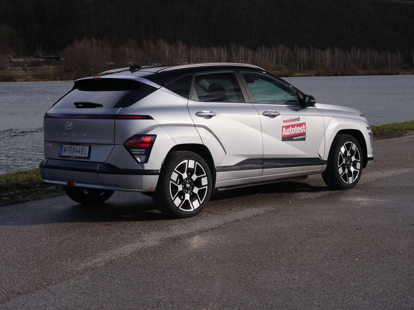 Der Kona mit der großen 65,4-kWh-Batterie soll laut Hyundai bis 514 Kilometer schaffen. Wir haben im Test bei niedrigen Temperaturen um die null Grad und Fahrten auf der Autobahn mit 130 km/h 360 Kilometer geschafft. Insofern sind, vorsichtig geschätzt, Reichweiten von gut 400 Kilometern durchaus realistisch. Im Vergleich zu anderen E-Autos dieser Klasse ist dies nach wie vor ein guter Wert. Geladen wird mittels 400-Volt-Technik flott in gut 40 Minuten von 10 auf 80 Prozent, wenn die Ladesäule mitspielt. Ein Plus darf sich Hyundai auch für die Suche nach der nächsten Ladesäule eintragen. Das funktionierte über den Screen leicht und flott.