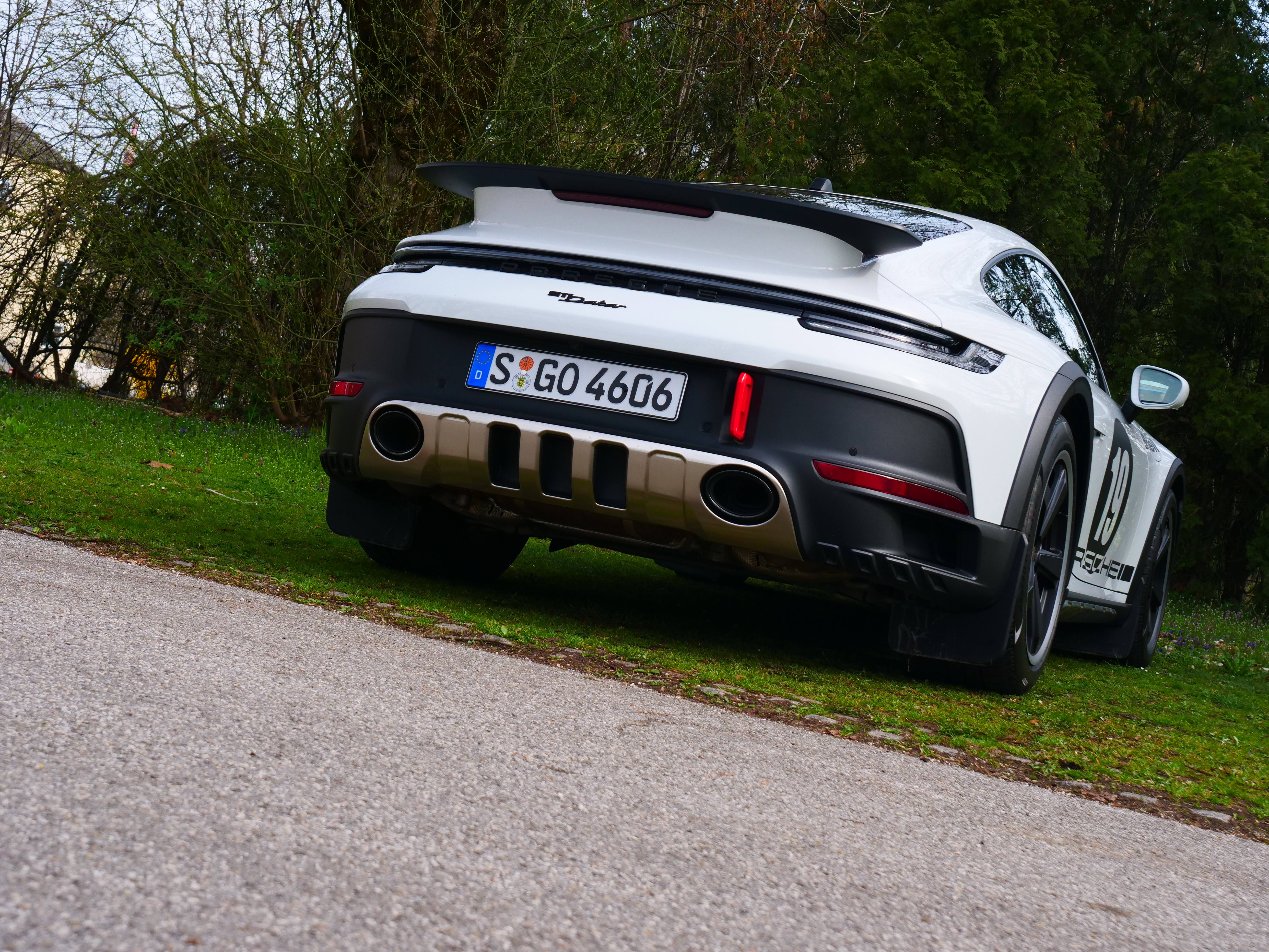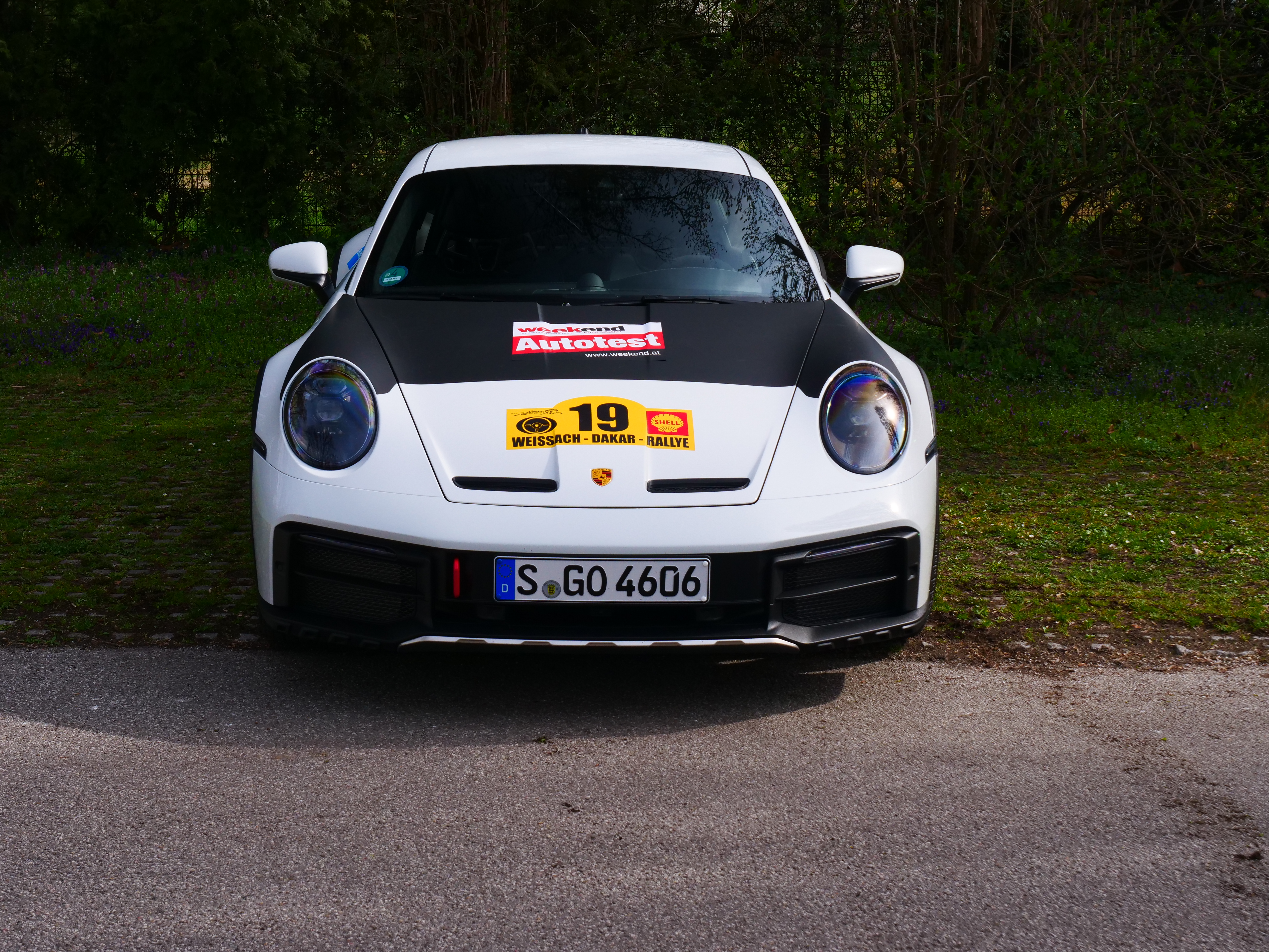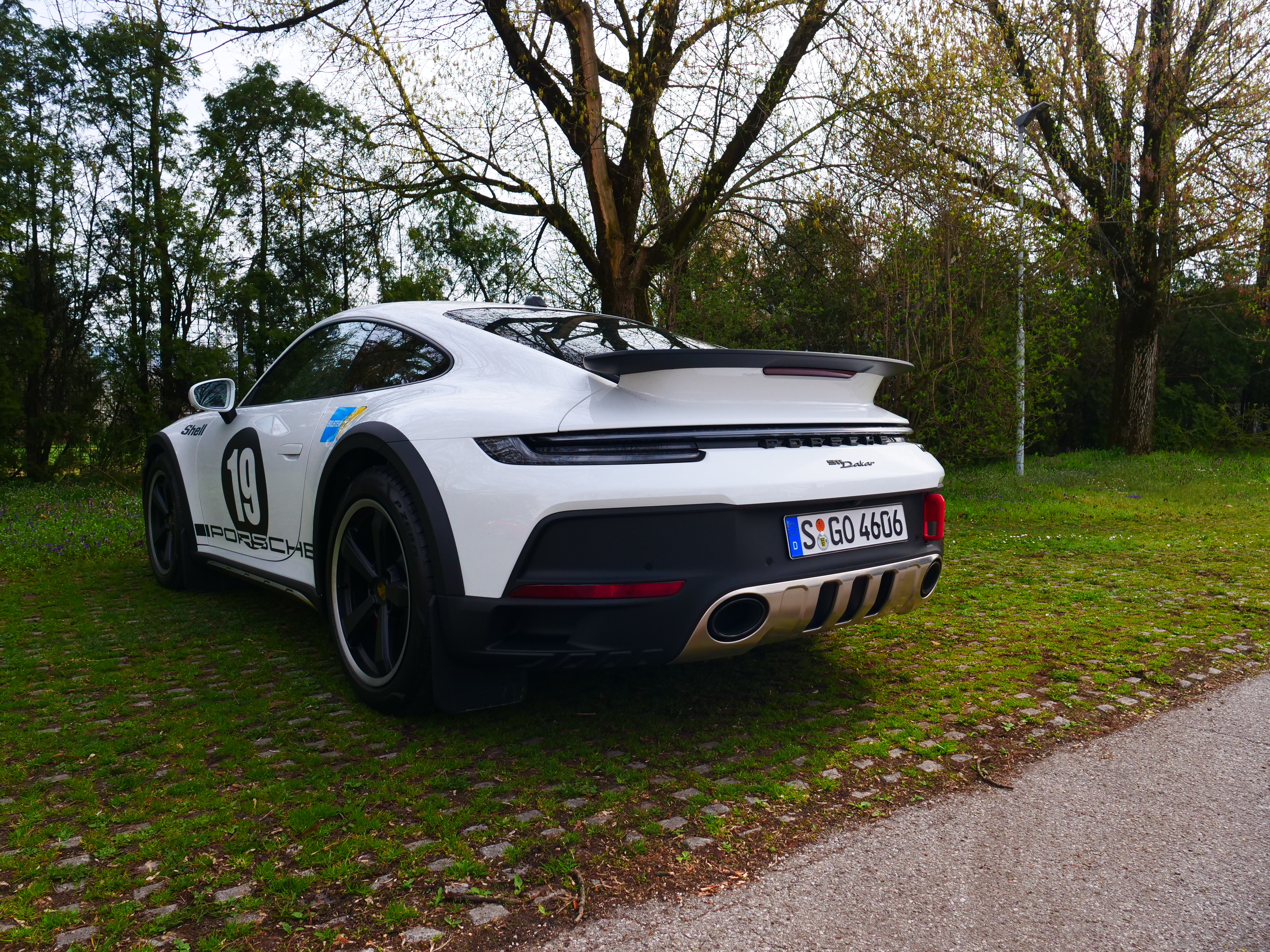 Im Unterschied zu anderen geländegängigen Autos kann der dem Wahnsinn verfallene Dakar-Pilot gerne 170 km/h hochbeinig im Offroadbereich fahren. Erst danach senkt der Porsche auf „normales“ Niveau. Interessanterweise fühlte sich unser Testauto sehr wohl auf gut ausgebauten Landstraßen eben sehr wohl. Ganz ehrlich? Wir konnten nicht viel Unterschied zu einem „gewöhnlichen“ 911 erkennen. Dazu kommen toll dosierbare Bremsen, der brutale Sound, schnell schaltendes Automatikgetriebe (8-Gang-PDK), die direkte Lenkung und alles was wir so an einem Porsche lieben. Ein bisschen rutschen tut er halt in den Kurven, wenn es nass ist. Aber ist ja auch Sinn der Sache. Dabei spielten die speziellen Winterreifen auch eine Rolle. Und wer den Fahrmodus „Rallye“ einstellt, muss ohnehin darauf gefasst sein, dass der Allradantrieb ziemlich hecklastig agiert. Auf 100 km/h geht es übrigens in nur 3,4 Sekunden.