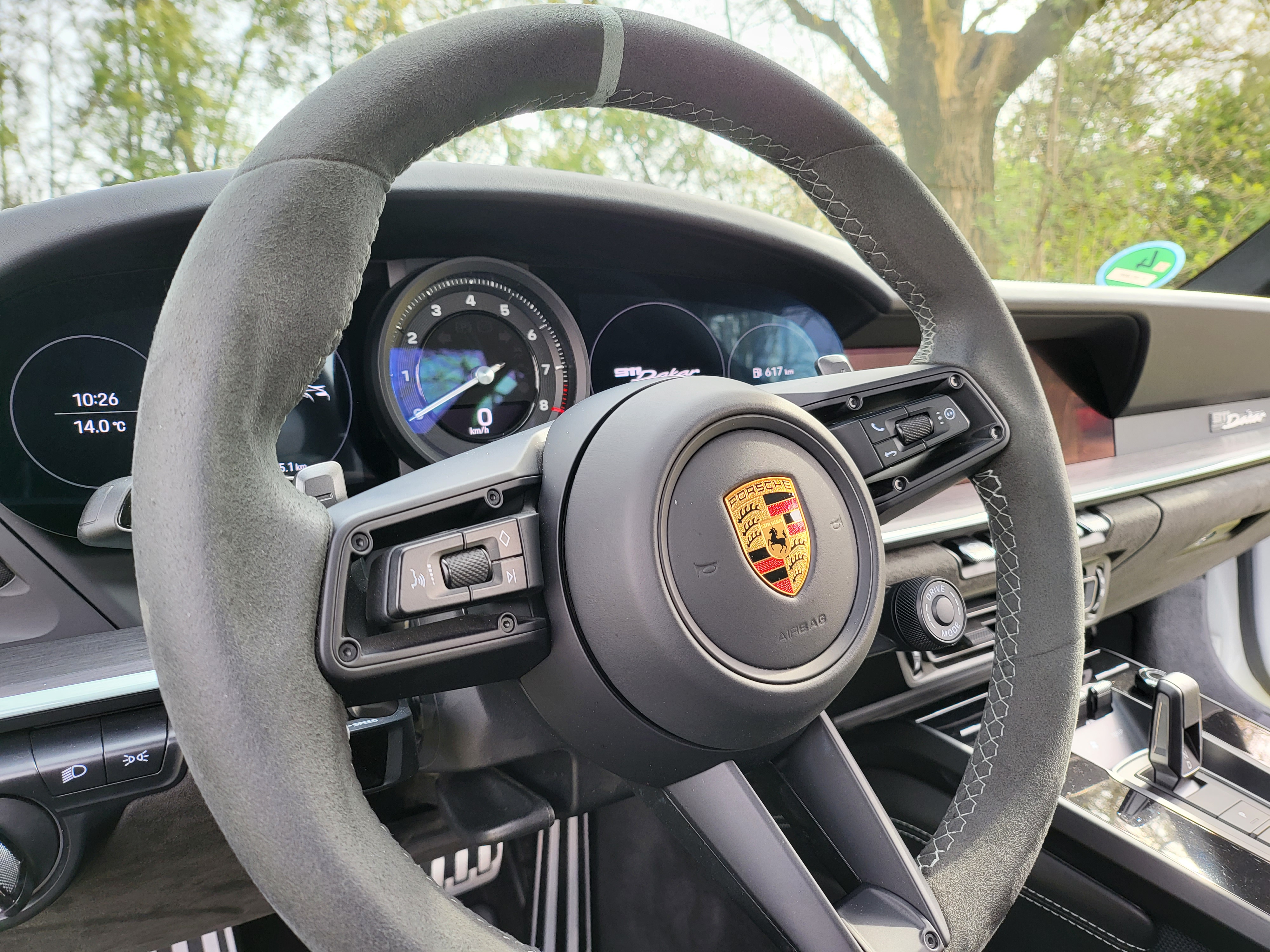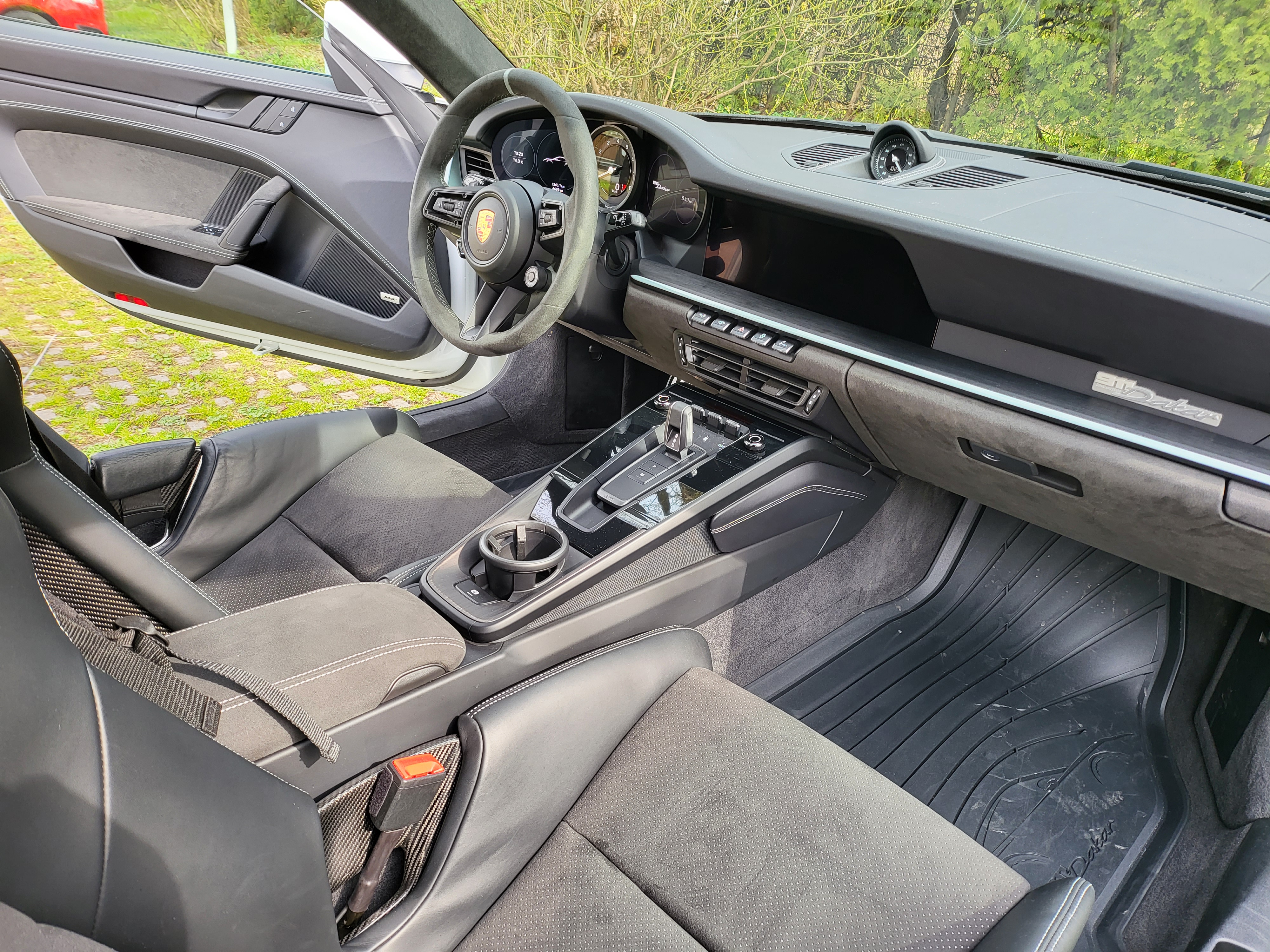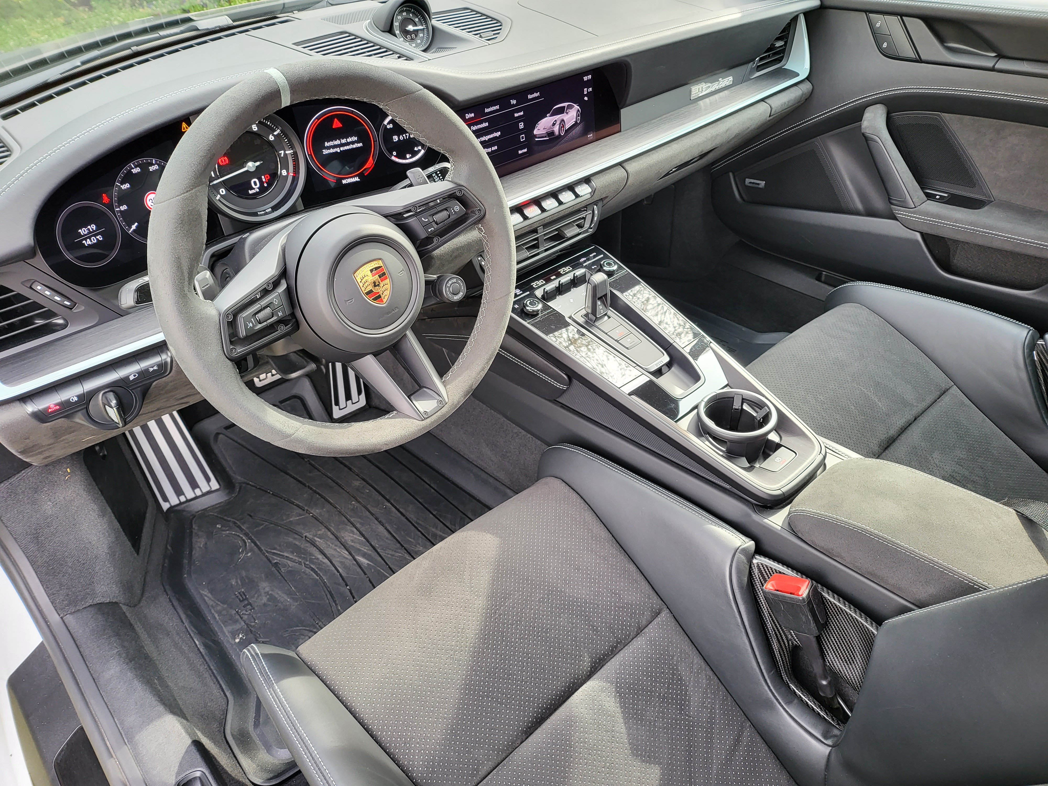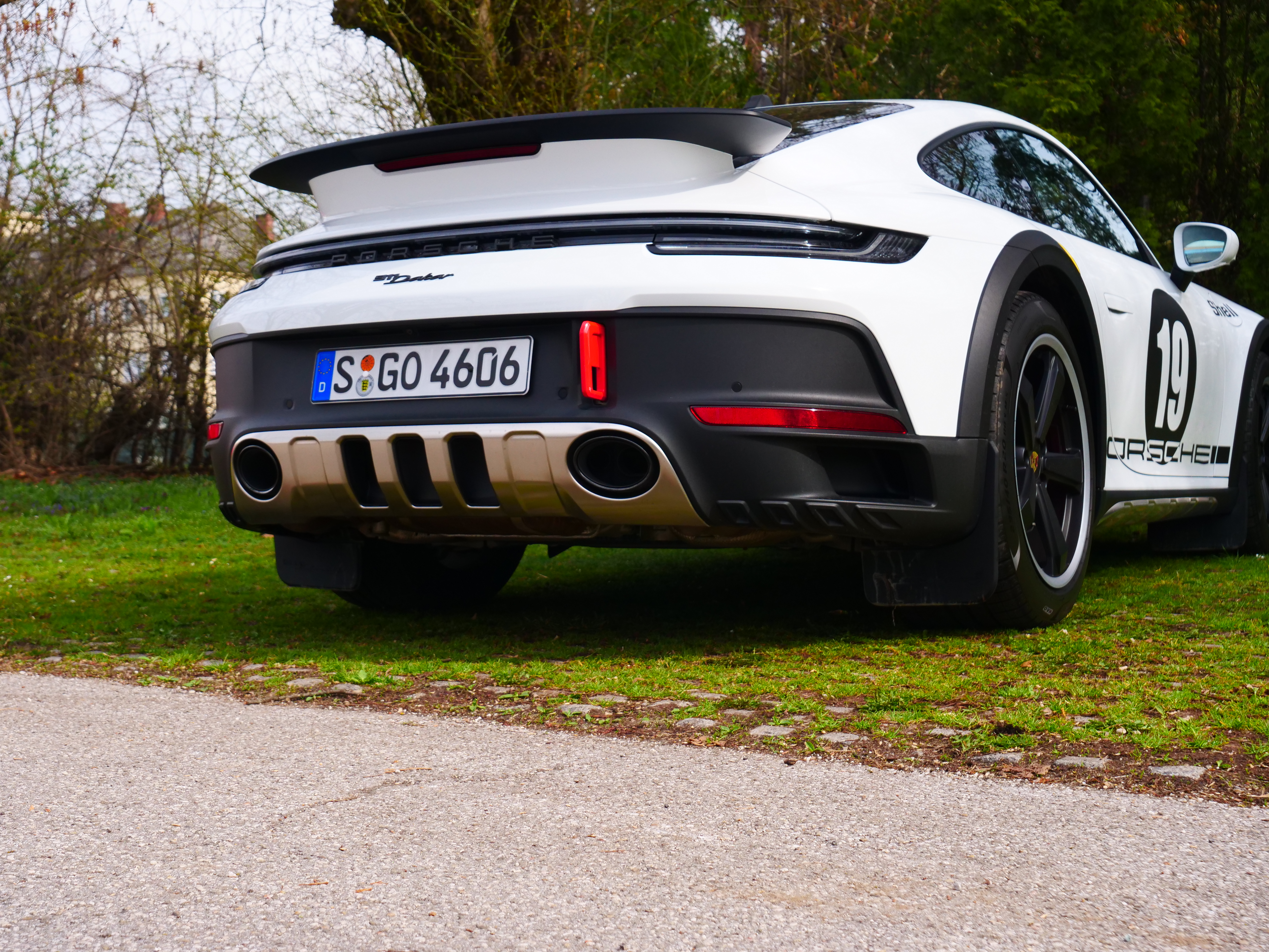Im Unterschied zu anderen geländegängigen Autos kann der dem Wahnsinn verfallene Dakar-Pilot gerne 170 km/h hochbeinig im Offroadbereich fahren. Erst danach senkt der Porsche auf „normales“ Niveau. Interessanterweise fühlte sich unser Testauto sehr wohl auf gut ausgebauten Landstraßen eben sehr wohl. Ganz ehrlich? Wir konnten nicht viel Unterschied zu einem „gewöhnlichen“ 911 erkennen. Dazu kommen toll dosierbare Bremsen, der brutale Sound, schnell schaltendes Automatikgetriebe (8-Gang-PDK), die direkte Lenkung und alles was wir so an einem Porsche lieben. Ein bisschen rutschen tut er halt in den Kurven, wenn es nass ist. Aber ist ja auch Sinn der Sache. Dabei spielten die speziellen Winterreifen auch eine Rolle. Und wer den Fahrmodus „Rallye“ einstellt, muss ohnehin darauf gefasst sein, dass der Allradantrieb ziemlich hecklastig agiert. Auf 100 km/h geht es übrigens in nur 3,4 Sekunden.