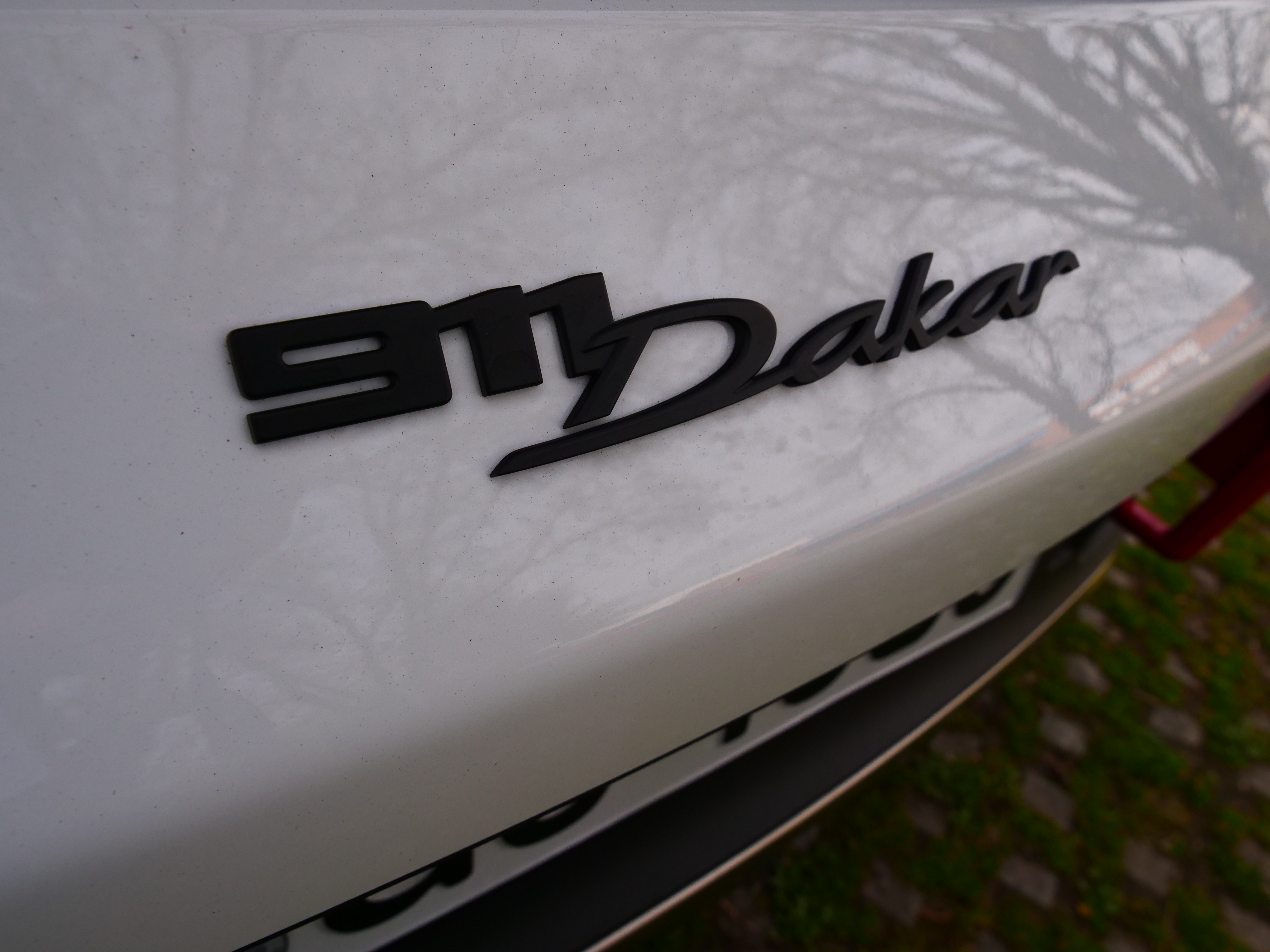 Da wird es ein bisschen kompliziert, denn für den Dakar gibt es verschiedene Folierungen. Die am Testfahrzeug verewigte Nr. 19 soll nicht an die Rallye Dakar erinnern, sondern an die 5.000 Kilometer lange East African Safari 1971. Egal, ein Modellname East African Safari wäre wohl sowieso ein Blödsinn. Wer möchte, kann also gegen einige Tausender Aufpreis auch im echten blauweißen Dakar-Look vorfahren. Generell gibt es Offroadmerkmale wie Luftöffnungen in der Fronthaube, Berge-Ösen vorne und hinten (haben wir nicht gebraucht, zum Glück), verbreiterte Radhäuser, Edelstahlseitenschweller und andere Lustigkeiten.