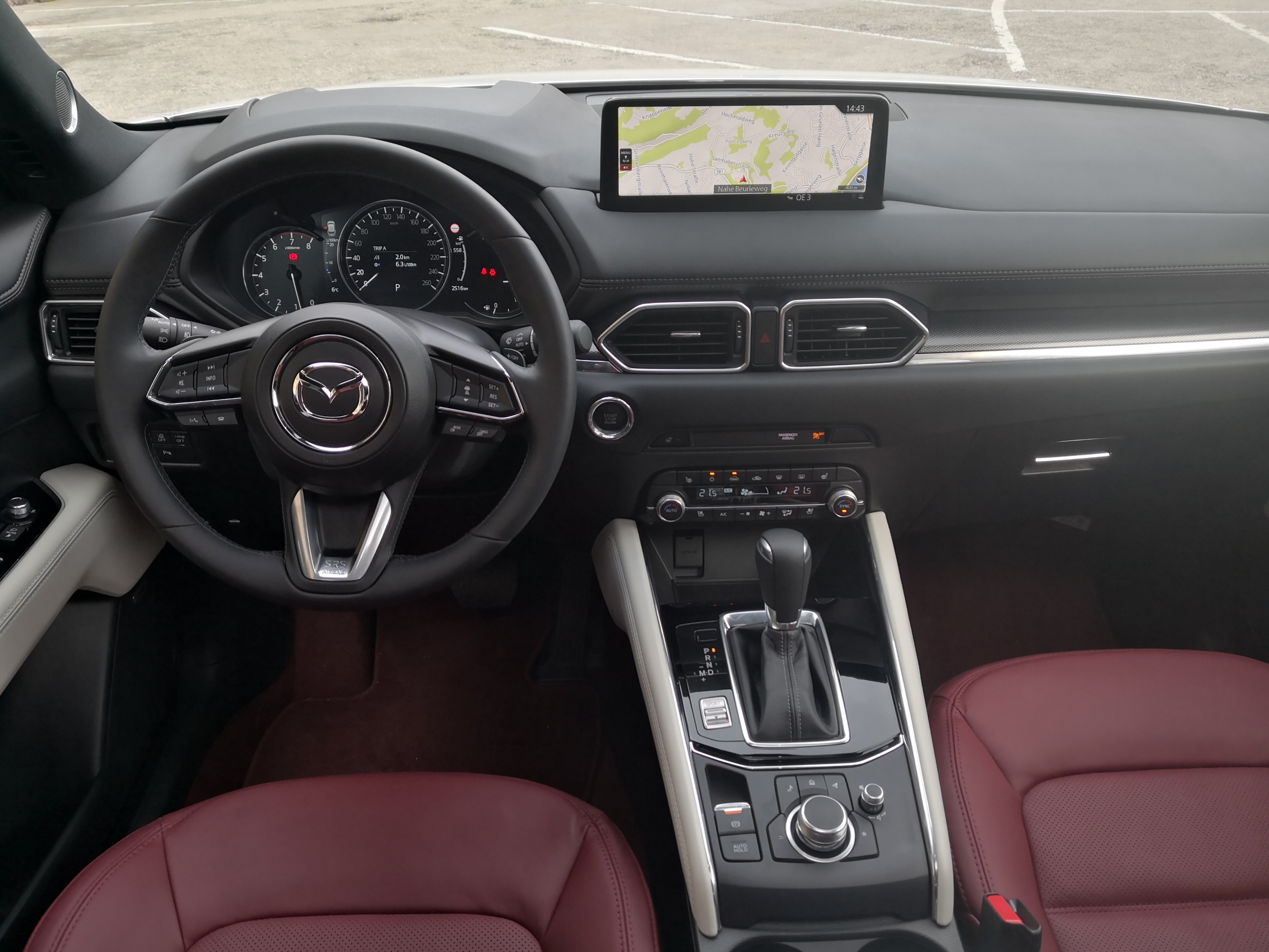Zum 100er hat uns Mazda eine Jubiläumsmischung zum Testen in die Hand gedrückt. Die optische Mischung besteht aus einer weißen Außenhaut und viel Burgundrot im Inneren. Genauer gesagt: Rotes Leder trifft auf roten Teppich und beige-weiße Accessoires. Wer genauer hinsieht, findet das rote „100 Years-Logo“ an den Leichtmetallfelgen sowie seitlich am vorderen Kotflügel. Der „100-Jährige“ basiert auf dem Modelljahrgang 2021 des CX-5, und da in der Ausstattungsvariante Takumi Plus – er ist also ganz oben in der Modellnahrungskette erhältlich. Das bedeutet unter anderem, dass alle verfügbaren Assistenten mit an Bord sind: zudem unter anderem ein 10,25-Zoll-Farbdisplay, Apple-Car-Play, Android Auto, Bose-Soundsystem, eine extra scharfe Rückfahrkamera (360-Grad-Monitor). Auf den Innenraum bezogen heißt das: praktisch kein Teil, das aus der Hartplastikfraktion stammt. Wer vielleicht Vorurteile hinsichtlich japanischer Cockpits hegt, sollte sich das Sondermodell des CX-5 ansehen. Sehr gut gelungen! Mazda geht übrigens zwar den digitalen Weg, und so sind auch die Armaturen als Screen zu erkennen, aber man wird nicht mit unendlichen Eindrücken überfüttert. Alles klar und deutlich ablesbar. Auch wurde im Modelljahrgang 2021 nicht auf die wichtigsten Knöpfchen vergessen. Man hält dem Trend, alles über den Screen zu wischen, entgegen, was wir positiv sehen.