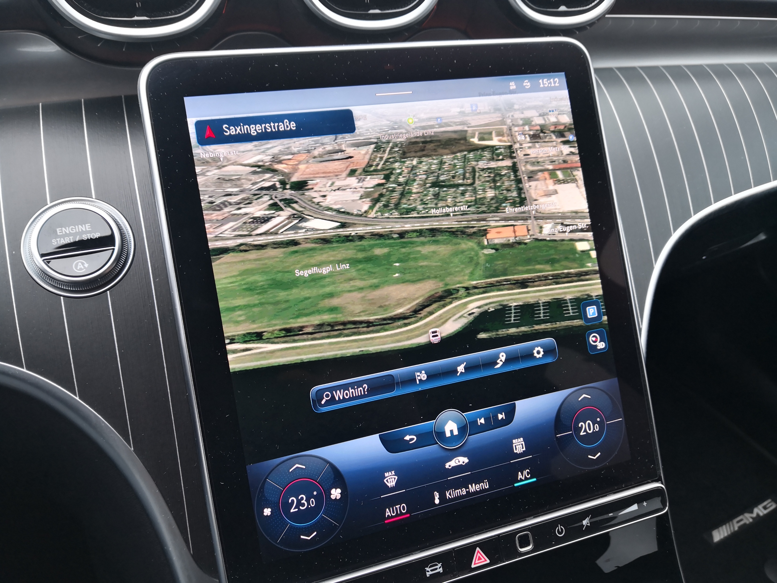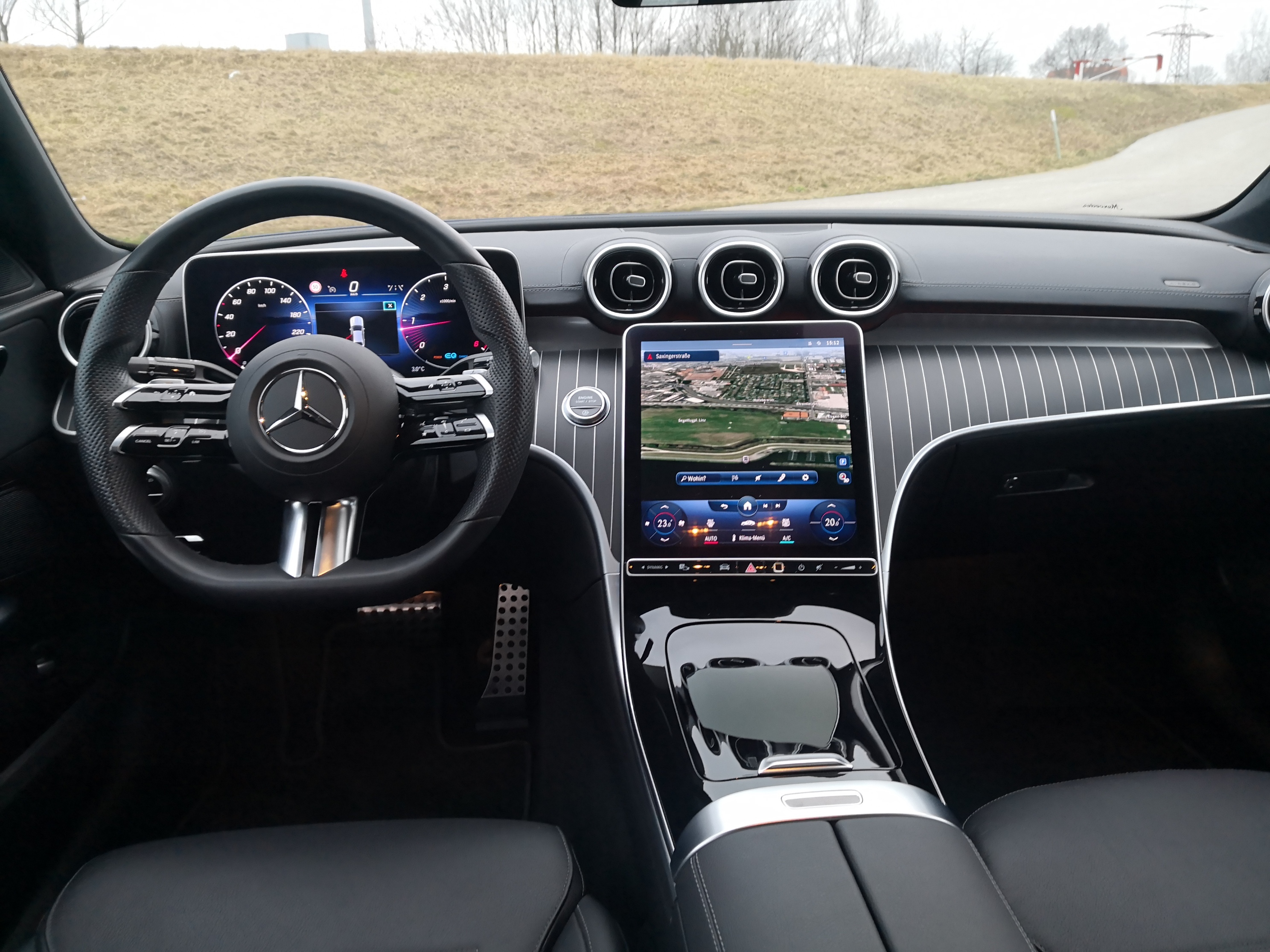 Kleine S-Klasse. Über Geschmack lässt sich zwar streiten, aber über die Verarbeitung nicht. Die Stuttgarter haben das Cockpit in dieser Klasse auf eine neue Ebene gehoben. Die verwendeten Materialien wirken nicht nur hochwertig, sie sind es auch. Leder an allen Ecken und Enden. Die Türverkleidung verdient die Bezeichnung „außergewöhnlich“. Hier einige Highlights: Der Hauptscreen ist scharf wie Chili und lässt sich trotz vieler Untermenüs gut bedienen. Das Navisystem blendet im Screen ein, wo man abbiegen muss. Der Sprachassistent ist einer der wenigen am Markt, der wirklich funktioniert. Und: Assistenten sind praktisch alle zu haben. Soviel Ausstattung kostet auch. Eine C-Klasse 220d startet bei 55.400,- Euro und mit der AMG-Line sind es 60.000,-. Ein bisserl nörgeln müssen wir trotzdem. Die Wisch-Bedienung übers Lenkrad ist ziemlich fummelig. Dafür ist die Klimabedienung trotz „Touch“ gut.