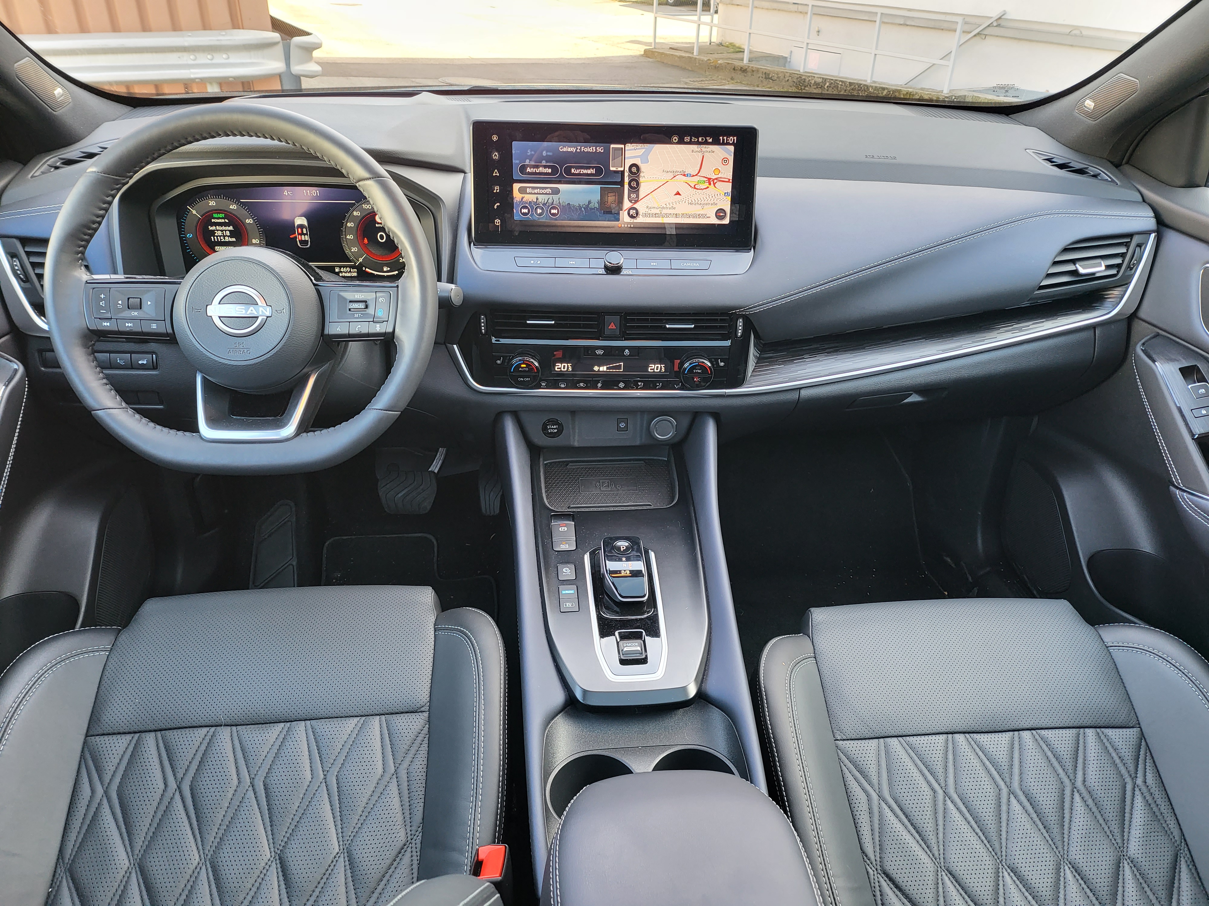 Beim Verbrauch schafften wir im besten Fall 6,3 Liter im Schnitt. Nissan spricht von 5,4 Litern. Insgesamt ein System, das vom Verbrauch her gesehen sicher Sinn macht. Immerhin misst der Japaner 4,42 Meter in der Länge und stellt 190 PS Systemleistung zur Verfügung. Insofern passe der Verbrauch. Beschleunigt auf 100 km/h wird in erfreulichen 7,9 Sekunden. Auch bei Fahrwerk wurde alles fein abgestimmt. Komfortabel mit einem Schuss Straffheit. Im Innenraum erkennt man den Markenbruder Nissan X-Trail wieder. Nissan verzichtet auf zu viel Herumfingern am Display und gönnt uns zumindest die wichtigsten Knöpfchen. Klima, Drive-Mode, EV-Taste, Multimedia und mehr lassen sich bedienen, ohne sich dabei in den weiten der Bildschirmmenüs zu vergaloppieren. Alle Wischfetischisten können aber auch alles großteils am Multimediascreen abwickeln. Hinsichtlich Materialien kommt zwar oft härterer Kunststoff zum Einsatz, aber der wird perfekt eingesetzt. Heißt: man merkt nix – schaut alles hochwertig aus. Einen Pluspunkt gibt es auch für das Lenkrad – das liegt gut in der Hand. Überhaupt wirkt der Qashqai ziemlich solide und beim Fahren sehr erwachsen.