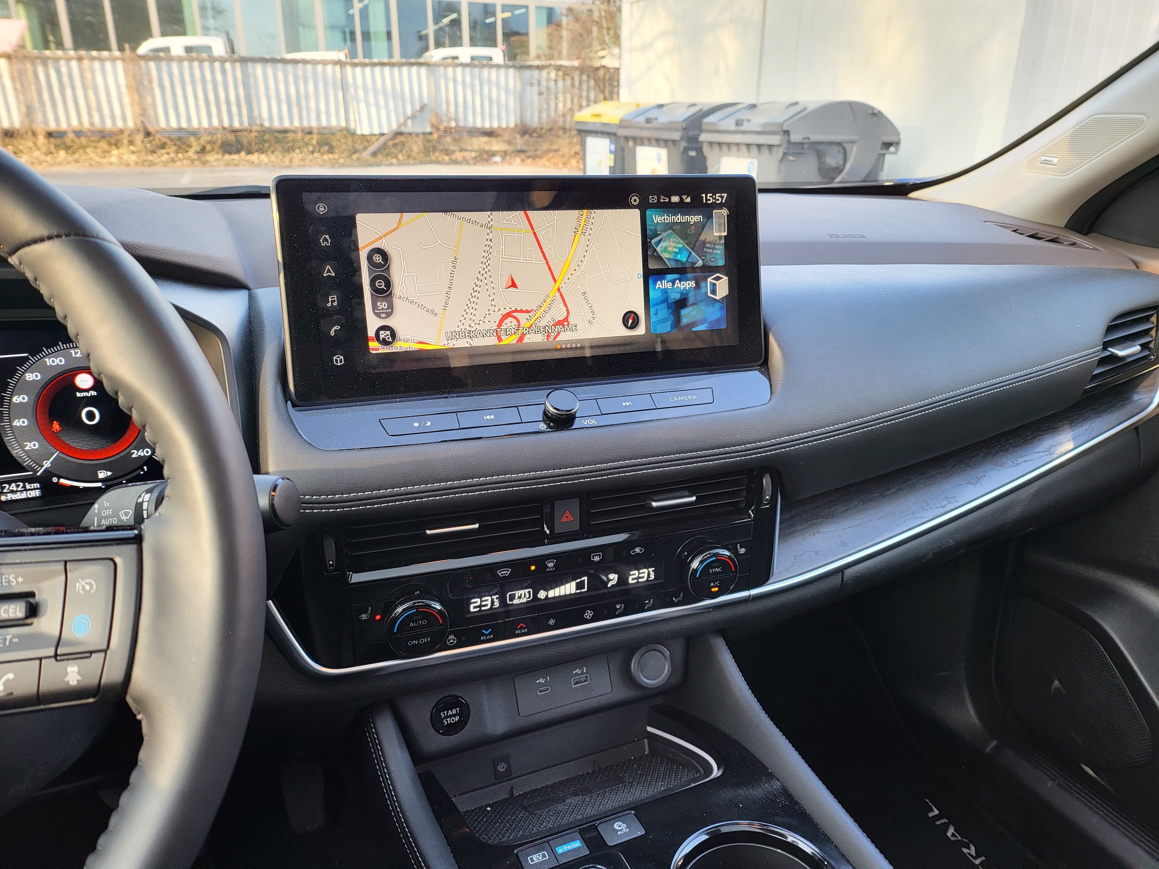 Stark vereinfacht ausgedrückt fährt dieser X-Trail rein elektrisch. Allerdings werkt im Hintergrund ein Benziner. Was? Wie? Also noch ein Stückerl einfacher erklärt: Ein 3-Zylinder Turbobenziner lädt einen kleinen Akku, der dann das Auto mit einem E-Motor antreibt. Der Vorteil dieses technischen Spagats ist folgender. Nachdem der Benziner die Batterie für den E-Motor lädt, muss man nicht zum Laden an die Steckdose, was wiederum Zeit spart. Das Fahrgefühl erinnert übrigens zeitweise an das eines Elektroautos. Vor allem beim Beschleunigen steht das Drehmoment schnell zur Verfügung. Und: man fährt in der Regel relativ lautlos durch die Gegend. Allerdings nicht immer, denn wenn der Benziner seine Arbeit tut, hört man dies doch im Hintergrund. Beschleunigung, der Tritt auf das Gaspedal und die Drehzahl des Motors gehen dabei keinen linearen Weg. An diesen Umstand gewöhnten wir uns aber schnell. Ein weiterer Vorteil dürfte die Haltbarkeit des Motors sein. Der 1,5-Liter-Benziner, wird ja kaum im höheren Drehzahlbereich gefahren und das freut den Verbrenner. Im Grunde sprechen wir von einem Hybrid, der auf gewisse Weise an ein E-Auto erinnert.